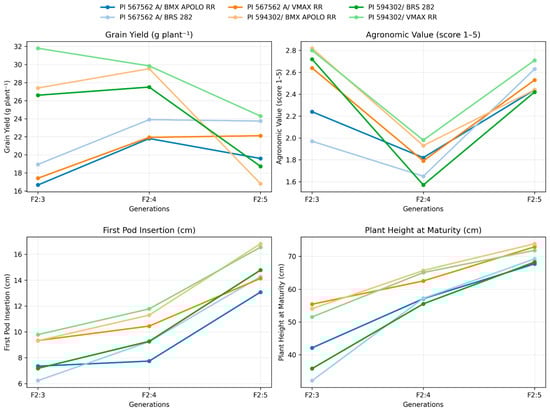 Agronomic value scores declined markedly in F2:4 across all populations, followed by a recovery in F2:5 (Figure 4). This trend indicates environmental influence and selection pressure during intermediate generations. PI 594302 × VMAX RR and PI 567562A × BRS 282 again displayed superior performance, highlighting their potential as donors of desirable agronomic traits in advanced breeding cycles.