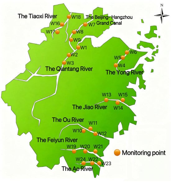 Zhejiang Province is located on the southeast coast of China, bordering the East China Sea to the east, Fujian Province to the south, Jiangxi Province to the west, Shanghai and Jiangsu Province to the north, and Anhui Province to the northeast. In this study, a total of 24 monitoring points were set up in the eight major river basins in Zhejiang Province, with 3 points being established in each section of the river. The specific river and point layout information is shown in Figure 1 and Table S2. The 24 monitoring points were selected in river sections that were located close to cities and industrial areas. This sampling method could better reflect the mutual influence between sucralose and human life and was more representative. The monitoring frequency for each point was 12 times a year, spanning from January 2019 to December 2024, with monitoring occurring once in the first ten days of each month (usually from the 5th to the 10th of each month). During sampling, extreme weather events were avoided, such as no sampling after rainstorm. The monitoring of rivers entering and leaving the lake was in line with routine monitoring, and the time period for this also ranged from January 2019 to December 2024.
