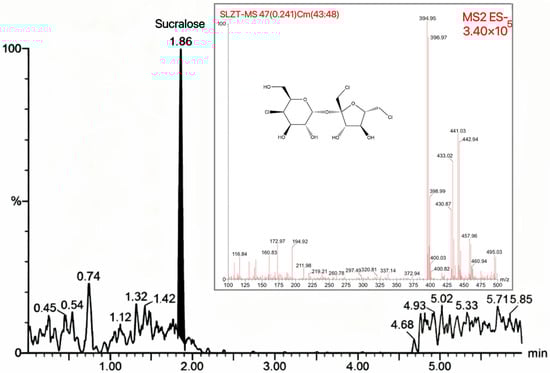 The trace detection method for sucralose was the LC-MS/MS external standard method, with a minimum detection limit of 0.01 μg/L. The liquid chromatography instrument model used was the Waters I-Class. The mass spectrometry instrument model was the Waters XEVO-TQS micro, and the chromatographic column employed was ACQUITY UPLCr BEH C18. The specific detection parameters were as follows: ion source: ESI; flow rate: 0.3 mL/min; injection volume: 10 μL; column temperature: 35 °C; mobile phase: A: 0.05% ammonia solution, B: methanol. Since the water sample was clean, it could be directly tested on the machine after passing through the membrane. If the water sample contained suspended solids, the sample was centrifuged (3000 rpm, 10 min) and then filtered. The 0.22 μm nylon membrane was used for filtration, and the recovery was verified by adding standard. The average recovery rate was 97.8% ± 2.1% (n = 6), which met the requirements of the method. The chromatogram and mass spectrum (primary mass spectrum) of sucralose were presented in Figure 2. In the mass spectrum, the quasi-ion peak at m/z 395 and the chloride isotope peaks at m/z 397 and m/z 399 of sucralose were clearly visible, which perfectly matched the standard mass spectrum in negative ion mode.
