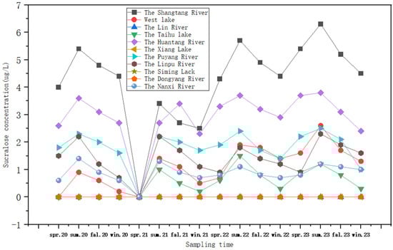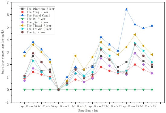 Concentration variation curves of sucralose in different years and seasons in various rivers.