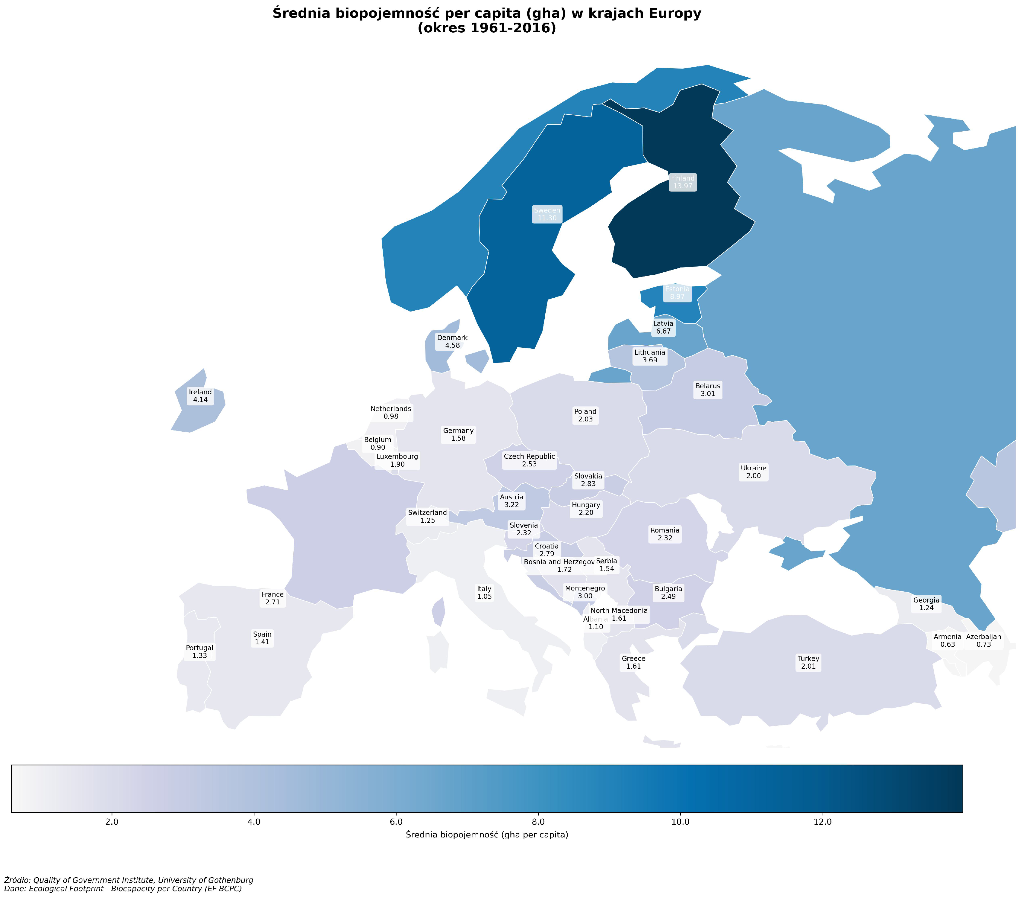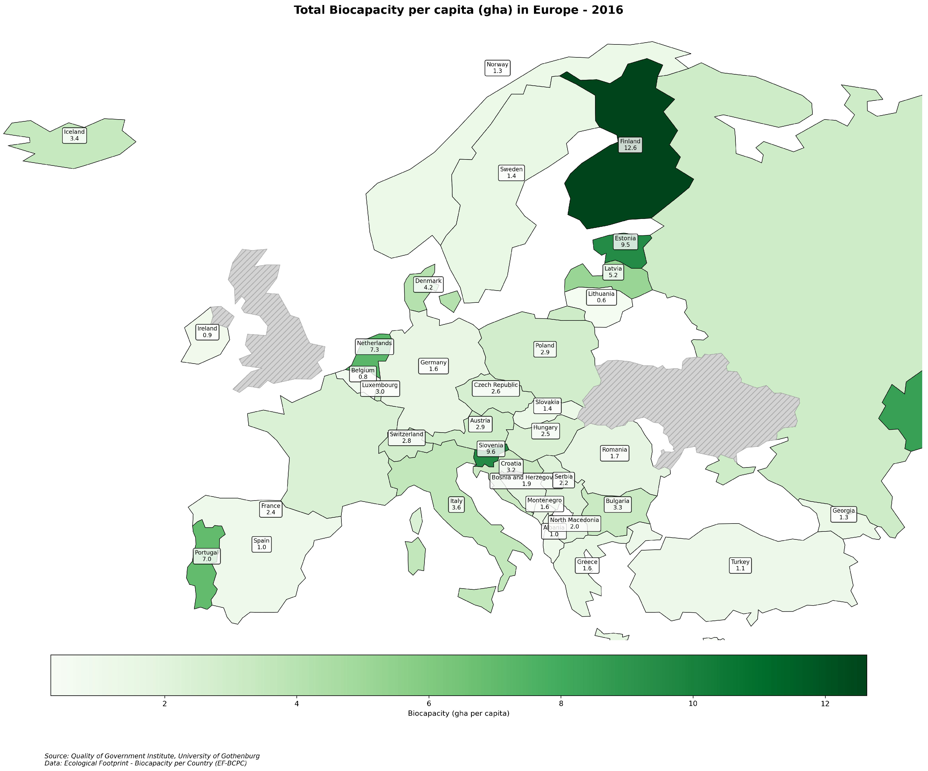 Figure 1. Spatial distribution of total biocapacity per capita (in global hectares, gha) across European countries for the year 2016. The map reveals a distinct latitudinal gradient, with exceptionally high values in Nordic nations (e.g., Finland, Sweden, Norway) attributable to vast forest cover and low population density, and the lowest values in highly urbanized and densely populated countries (e.g., Belgium, Netherlands, Malta).