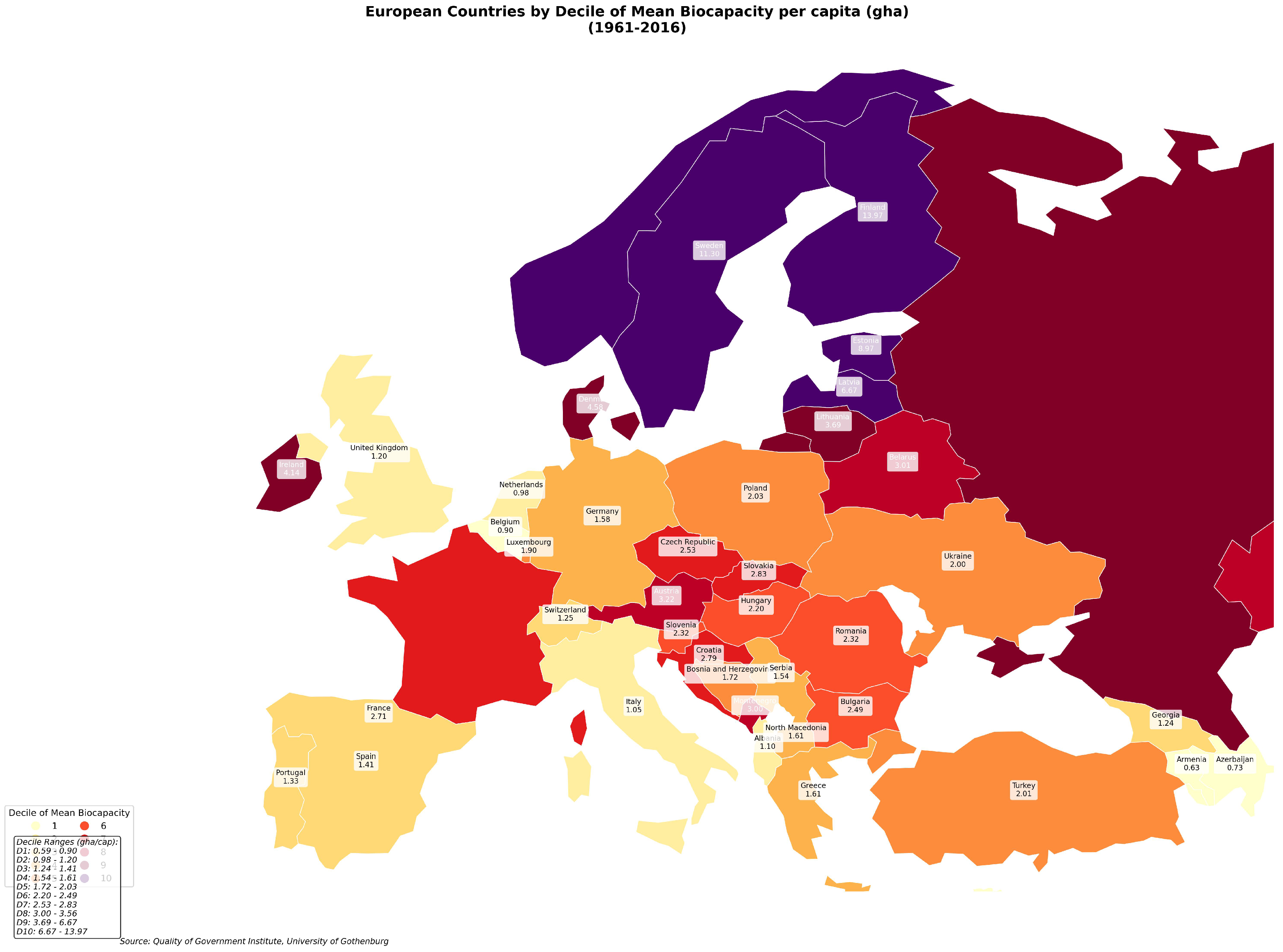 Figure 3. Bar chart illustrating the distribution of European countries by decile of their long-term mean biocapacity per capita (1961–2016). The chart quantifies the profound environmental inequality, showing that the top 10% of countries possess biocapacity values nearly 7.5 times greater than those of the bottom 10%.