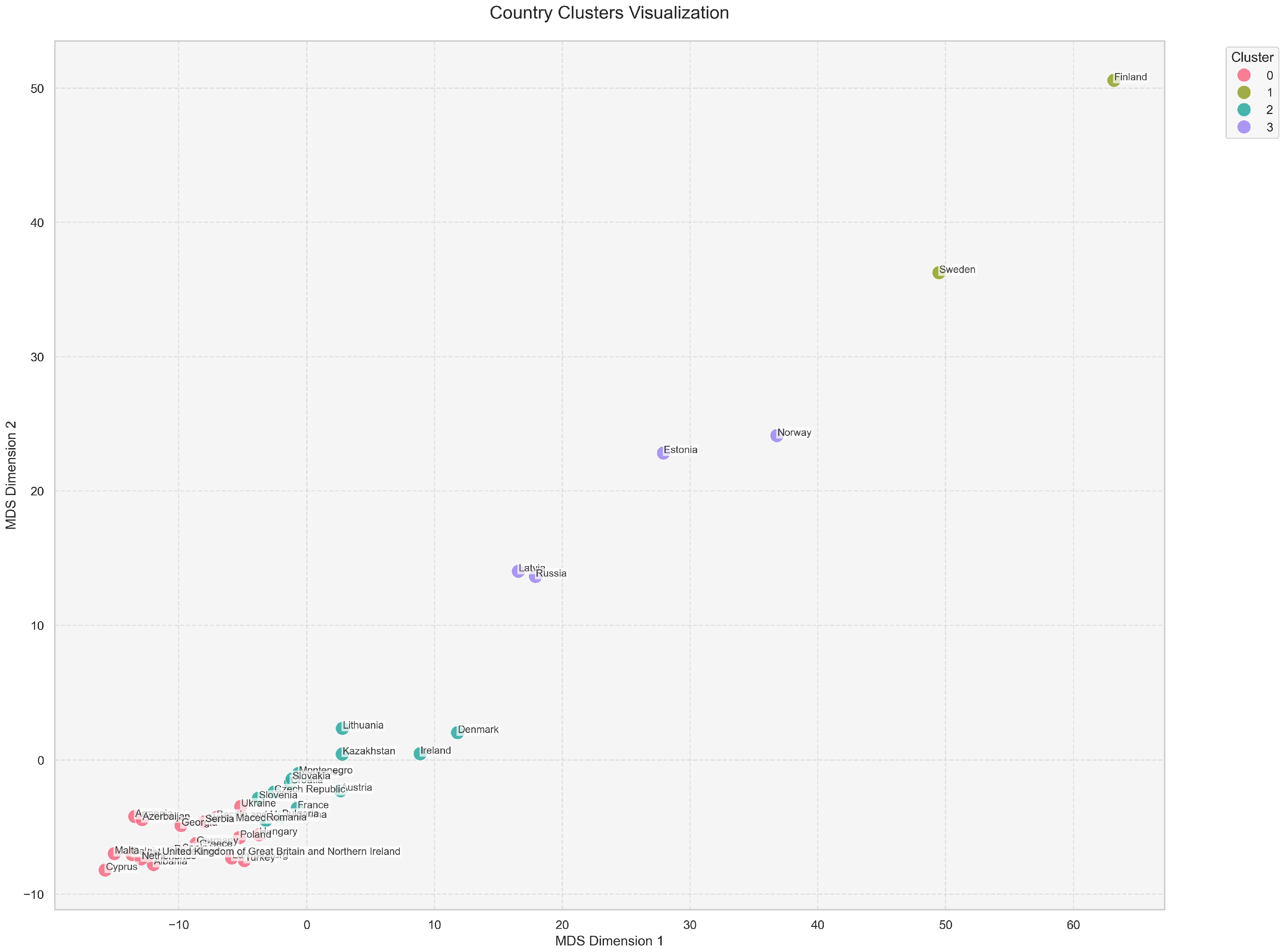 Figure 5. Geographic distribution of the four biocapacity clusters identified by the Dynamic Time Warping and k-means algorithm. The map shows the spatial grouping of 44 European countries based on the similarity of their long-term biocapacity per capita trajectories (1970–2022), revealing distinct regional patterns: Cluster 0 (Low-Stable) dominates Western, Southern, and parts of Eastern Europe; Cluster 1 (Very High) is confined to Finland and Sweden; Cluster 2 (Medium-Growing) is prevalent in Central and Eastern Europe; and Cluster 3 (High-Volatile) includes Nordic and Baltic nations.