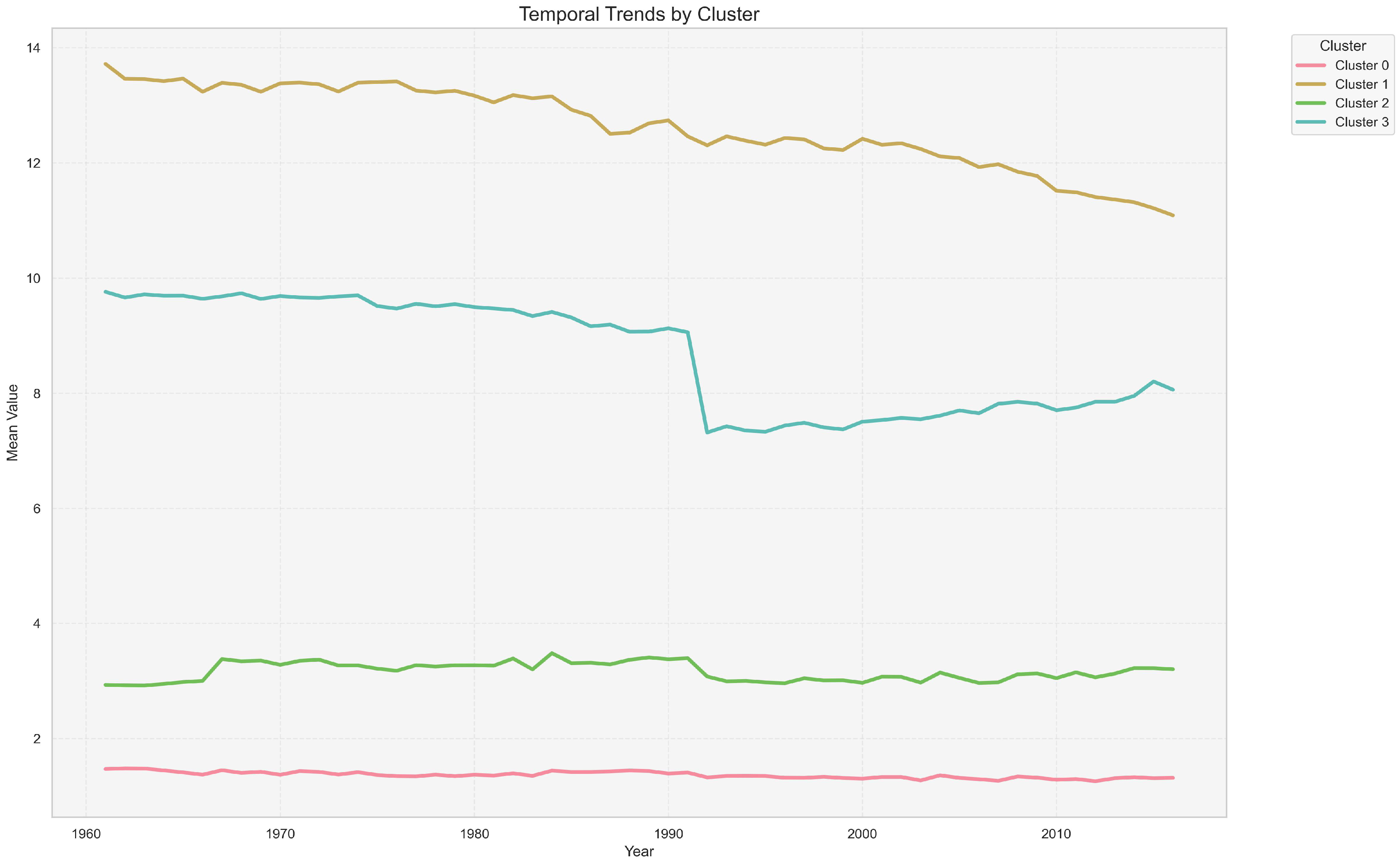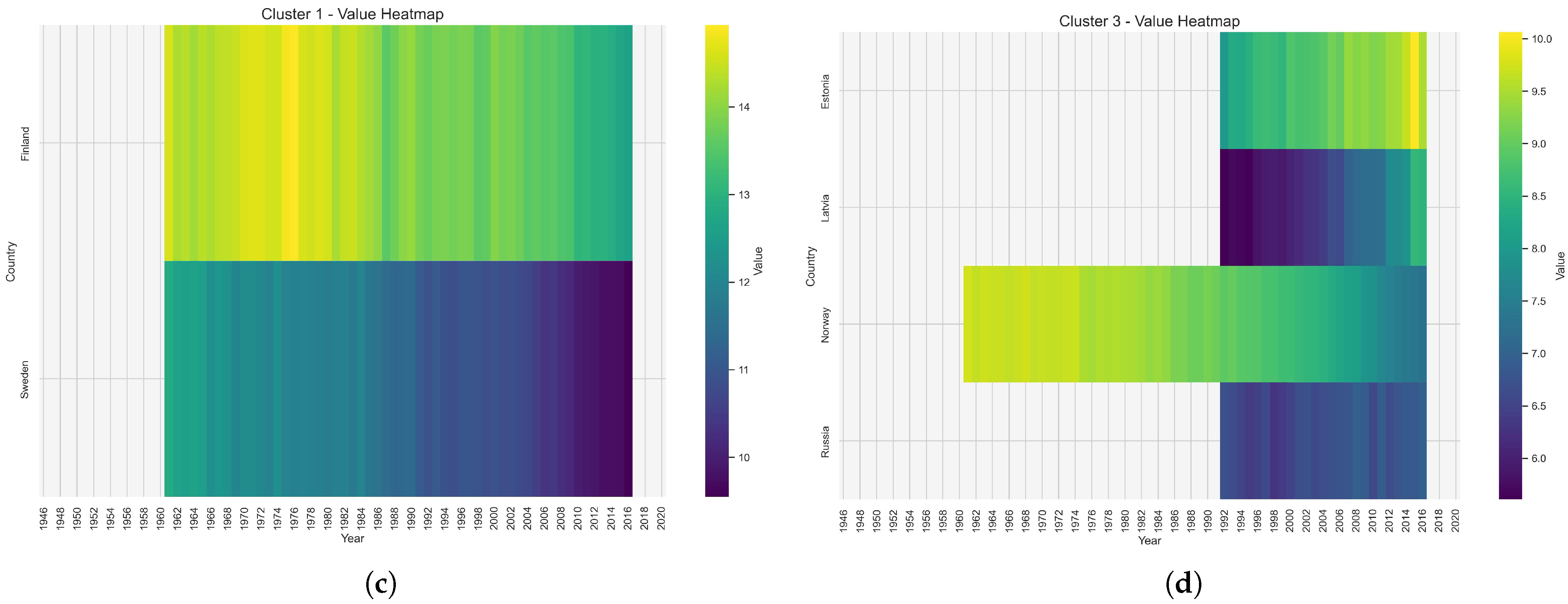 This hybrid approach enables the identification of clusters based on shared dynamic histories of biocapacity change, rather than on static similarities. The resulting clusters represent typical models of environmental transformation—such as “countries with early intensive degradation followed by late recovery” or “countries following a stable, balanced trajectory”—revealing socio-ecological similarities that remain undetected by methods ignoring temporal dynamics.
