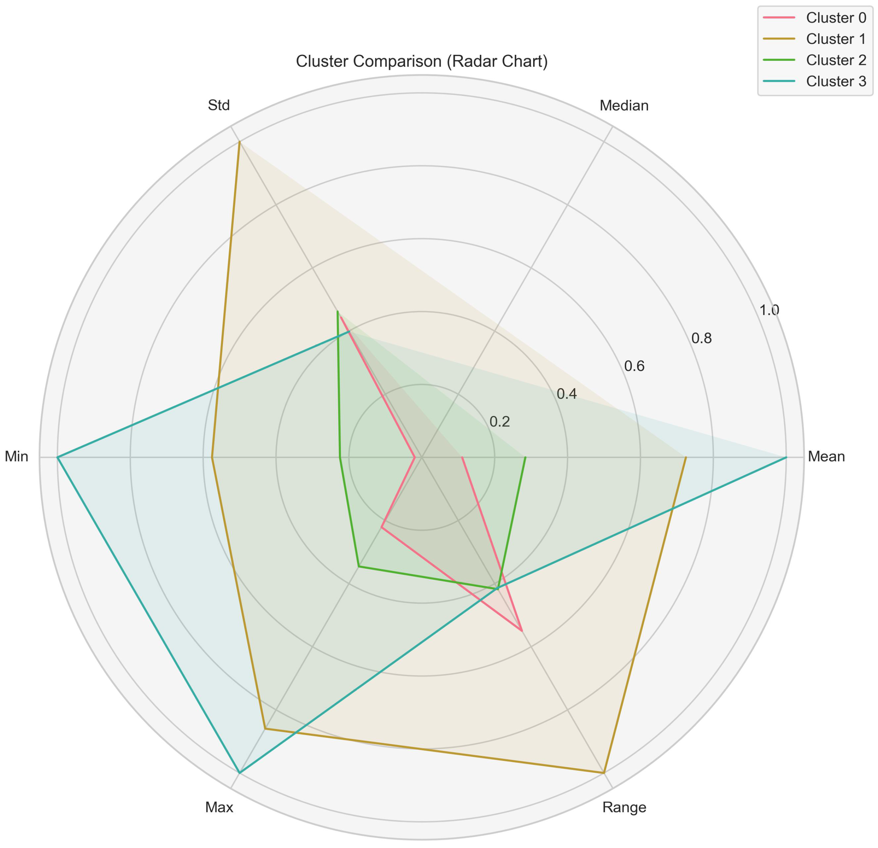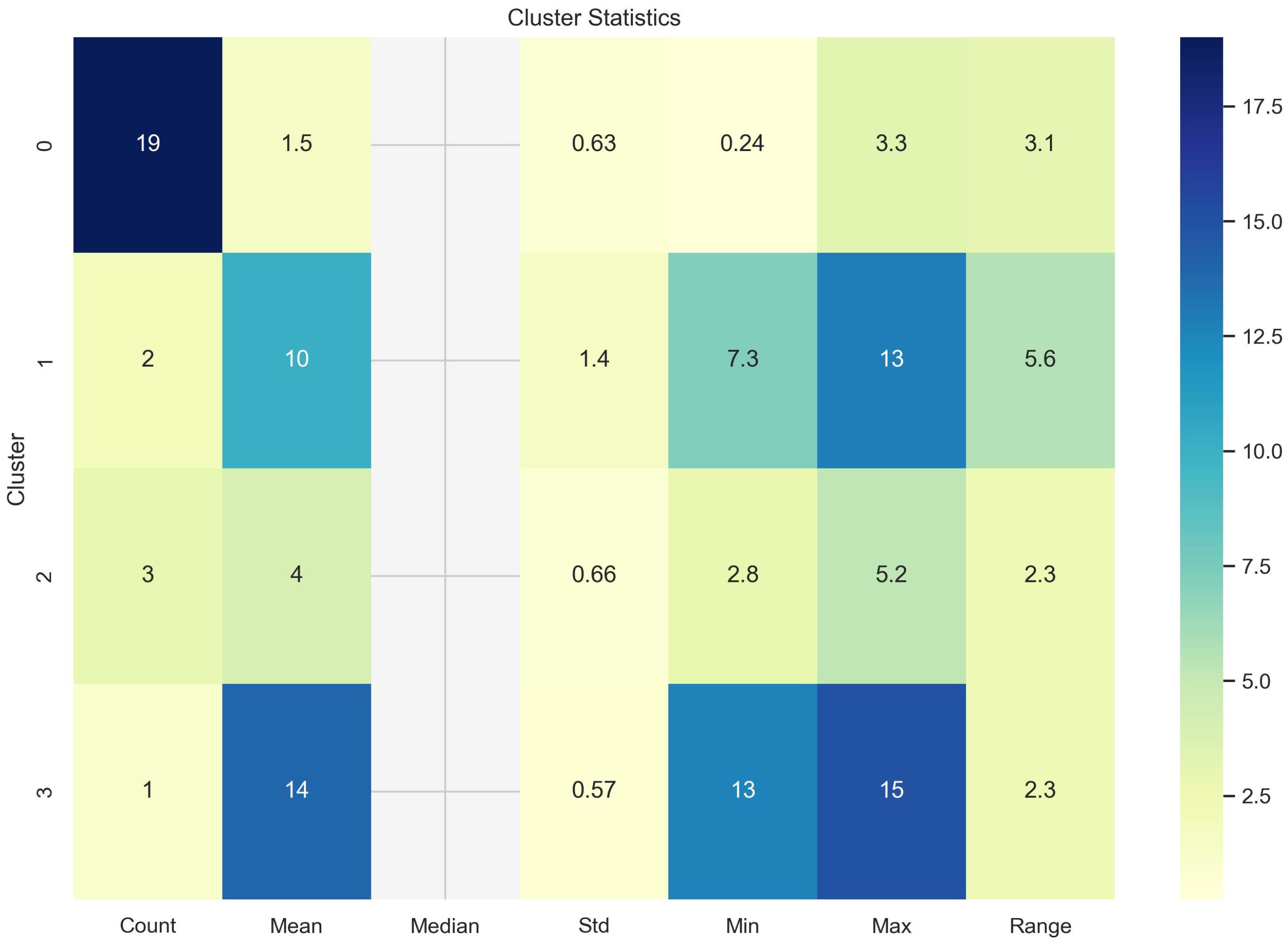 Figure 10. Summary statistics for the four biocapacity clusters. The chart presents key descriptive metrics for each cluster, including the number of countries, mean, median, standard deviation, minimum, maximum, and range of biocapacity values, providing a consolidated quantitative overview.