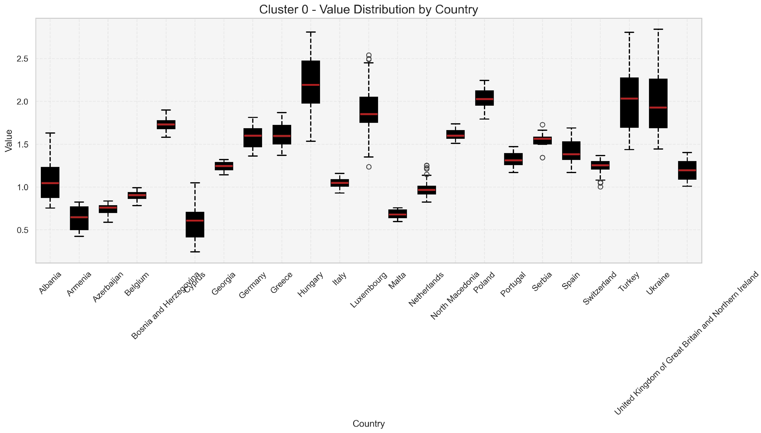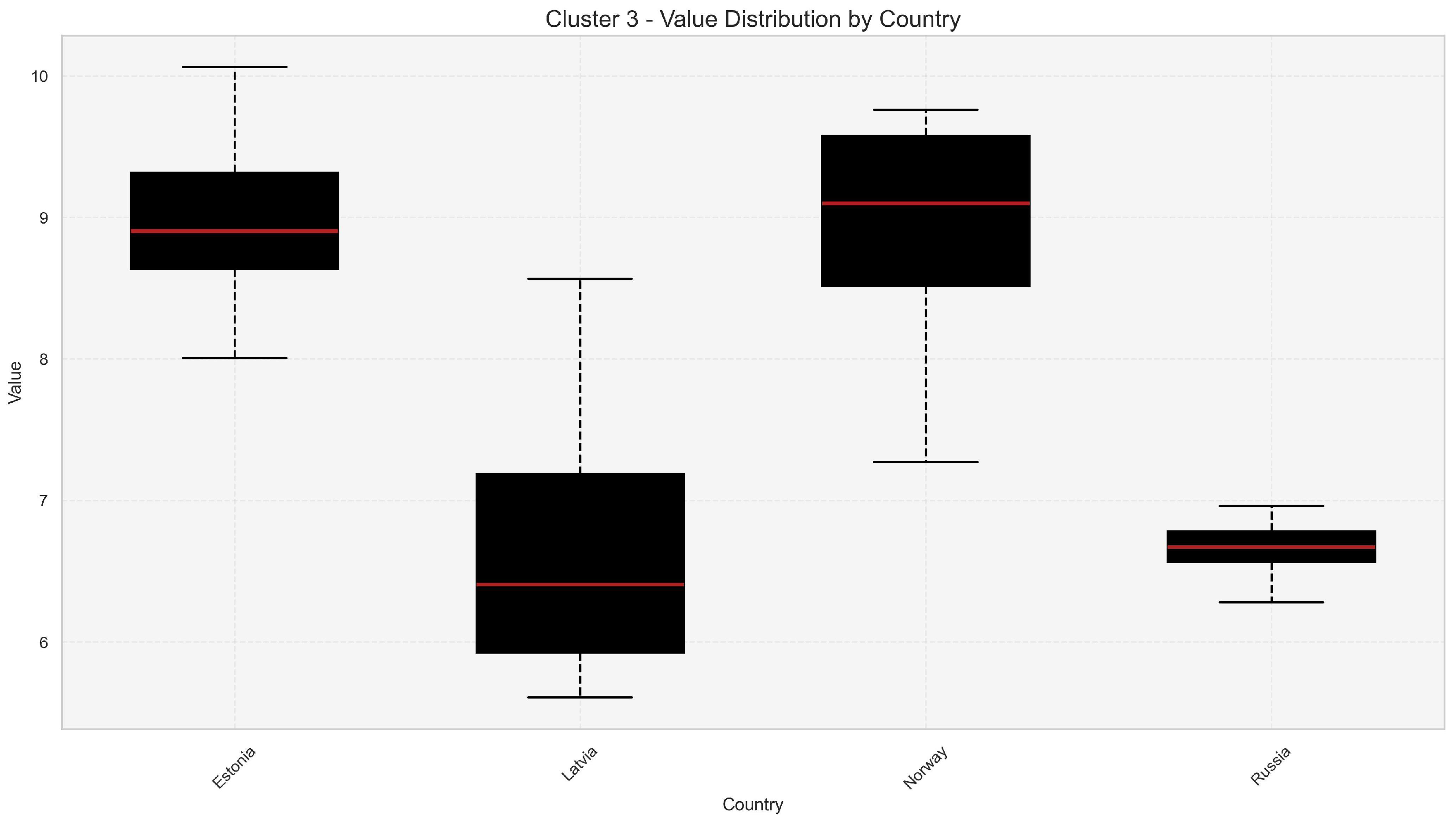 Figure 9. Visualization of the biocapacity distribution for Cluster 3 (High-Volatile). The plot characterizes this group (Estonia, Latvia, Norway, Russia) by a high median biocapacity alongside the greatest internal variability among all clusters, indicating significant differences in resource endowments and management.