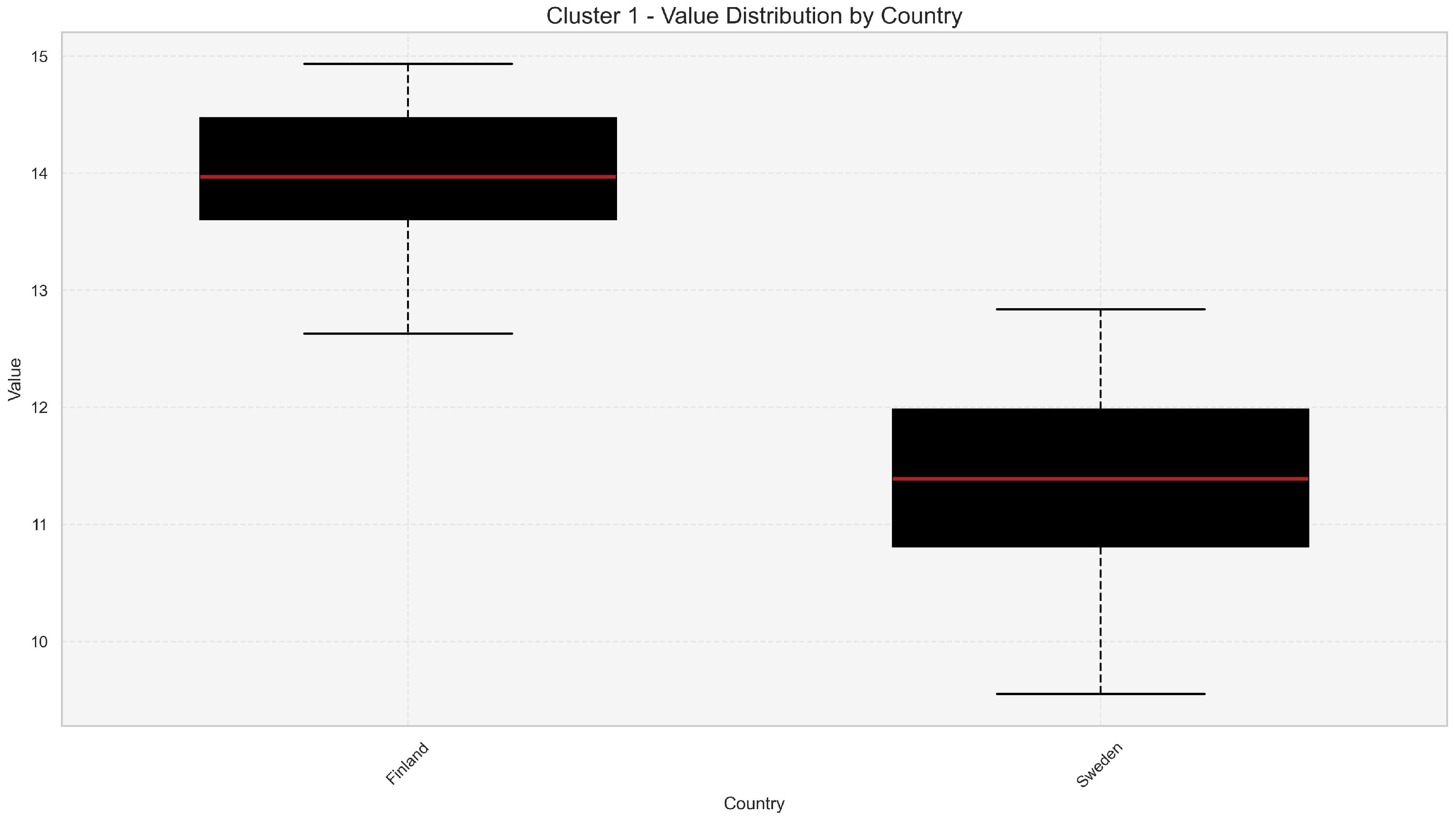 Figure 7. Visualization of the biocapacity distribution for Cluster 1 (Very High), comprising Finland and Sweden. The plot highlights the extremely high median value and the wide dispersion of biocapacity values within this cluster, significantly exceeding those of all other groups and underscoring the unique natural capital endowment of these Nordic countries.