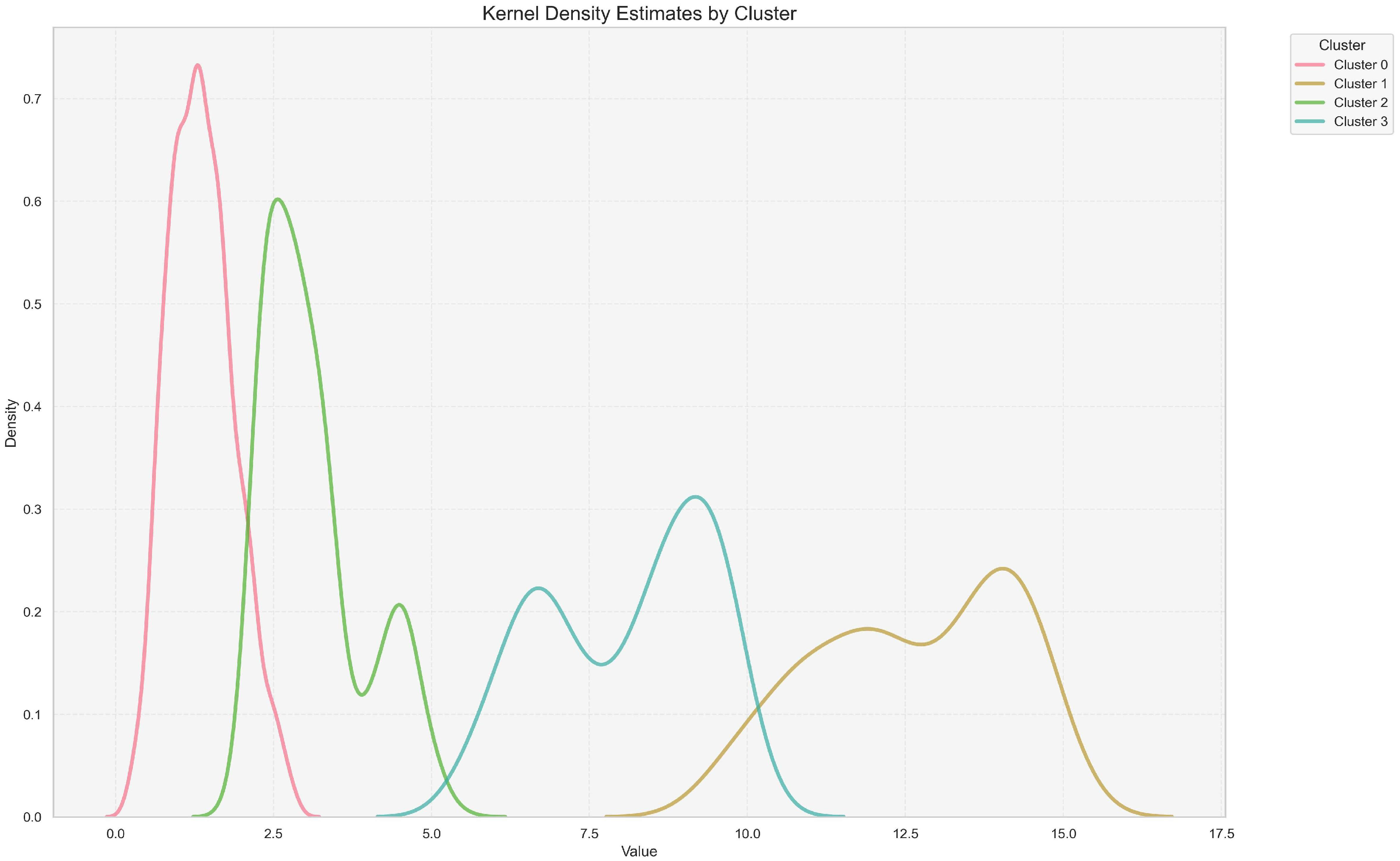 Figure 13. Kernel density estimates of biocapacity per capita for the four clusters. The smoothed probability density curves illustrate the distinct shapes and spreads of the distributions for each cluster, clearly separating the low, narrow distribution of Cluster 0 from the high, broad distributions of Clusters 1 and 3, and the intermediate profile of Cluster 2.