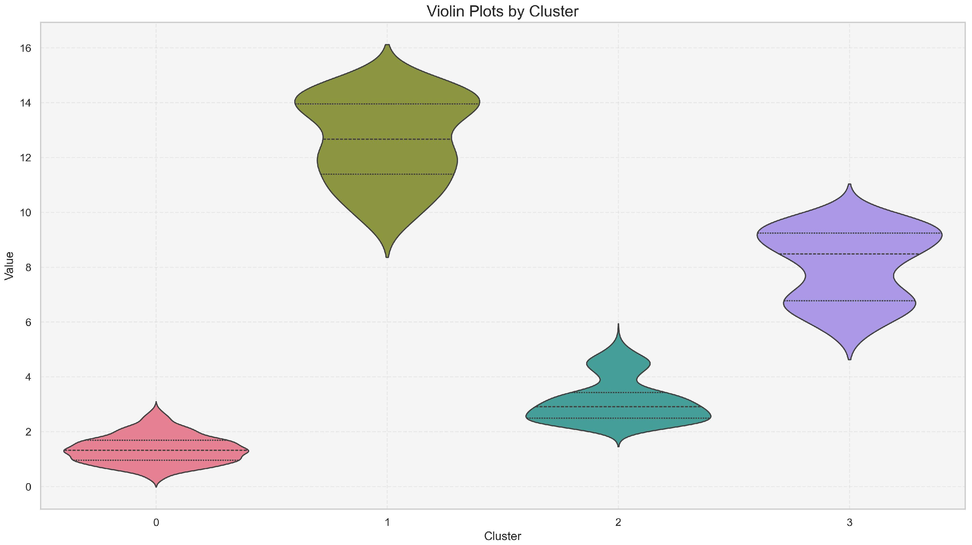 Figure 15. Violin plots for the four biocapacity clusters. The plots combine a box plot with a rotated kernel density plot on each side, providing a detailed view of the distribution, probability density, and shape of biocapacity values within each cluster.
