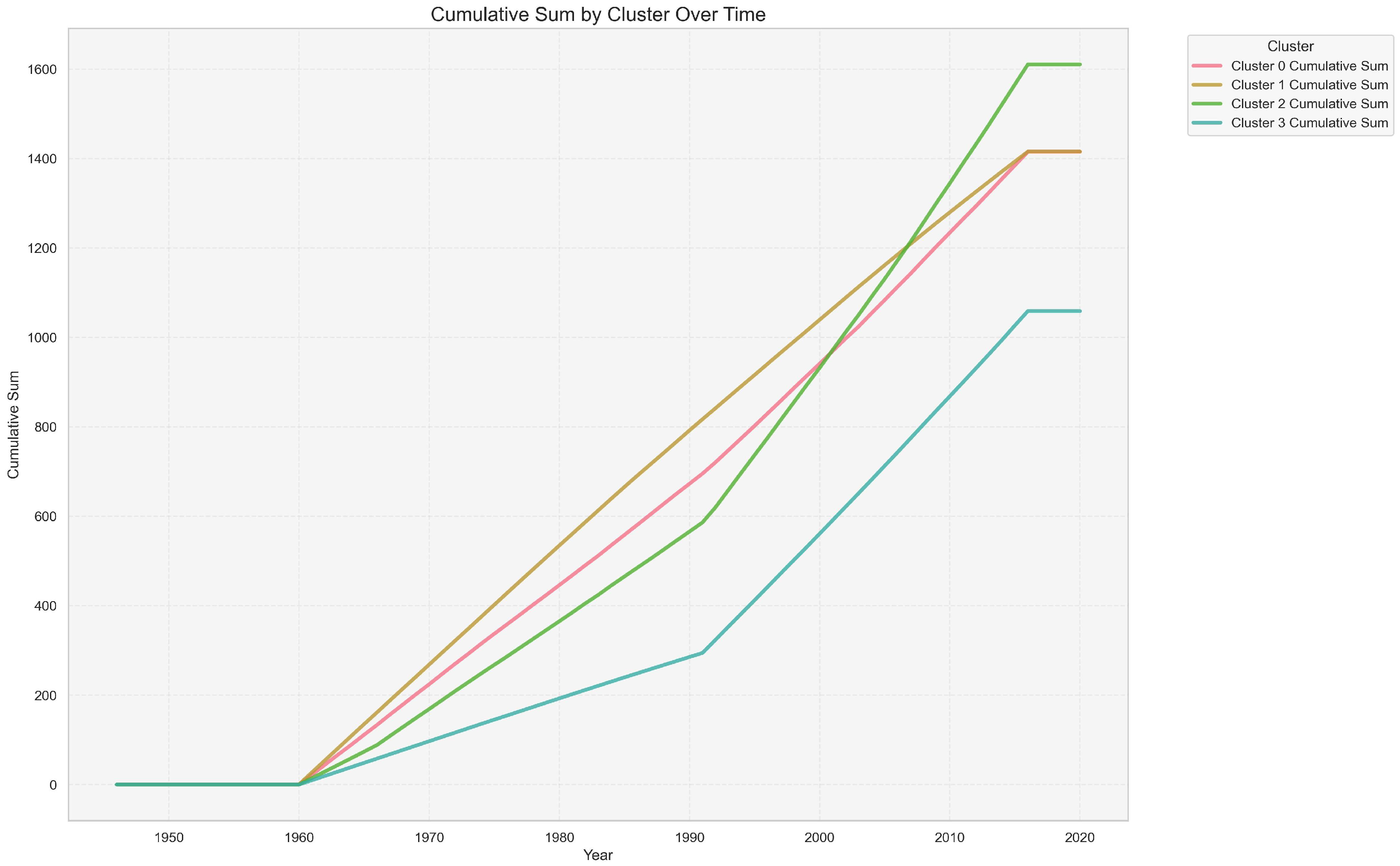 Figure 16. Cumulative sum of biocapacity per capita over time for each cluster. This plot visualizes the cumulative trajectory and total magnitude of biocapacity for the clusters, highlighting the growing absolute divergence between them over the decades.