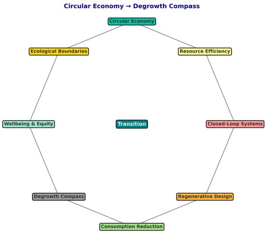 Circular economy (CE) frameworks aim to reduce waste, extend product lifecycles, and recover materials through reuse, remanufacturing, and recycling [24]. While these measures can improve resource efficiency, they are not substituting for absolute reductions in material and energy throughput. Without explicit limits, CE initiatives risk becoming an efficiency-led extension of the growth paradigm, potentially accelerating overall consumption through rebound effects [25]. A degrowth-aligned circular strategy referred to in Figure 5 addresses these shortcomings by embedding strong ecological ceilings and social foundations within its design, thereby reframing the CE as a tool for sufficiency rather than expansion.