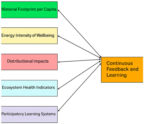 A degrowth by design strategy requires a robust measurement and learning architecture (Figure 7) that continuously evaluates progress toward ecological and social objectives while enabling adaptive policy responses. Indicators should go beyond GDP and focus on metrics that capture the relationship between material throughput, social equity, and ecological integrity [2,25].