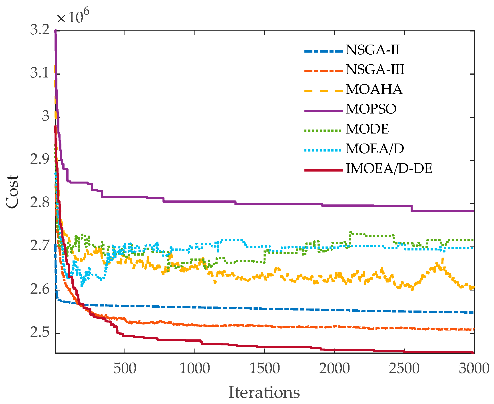 | IMOEA/D-DE | Best cost | 2.9829 × 106 | 2.9036 × 106 |