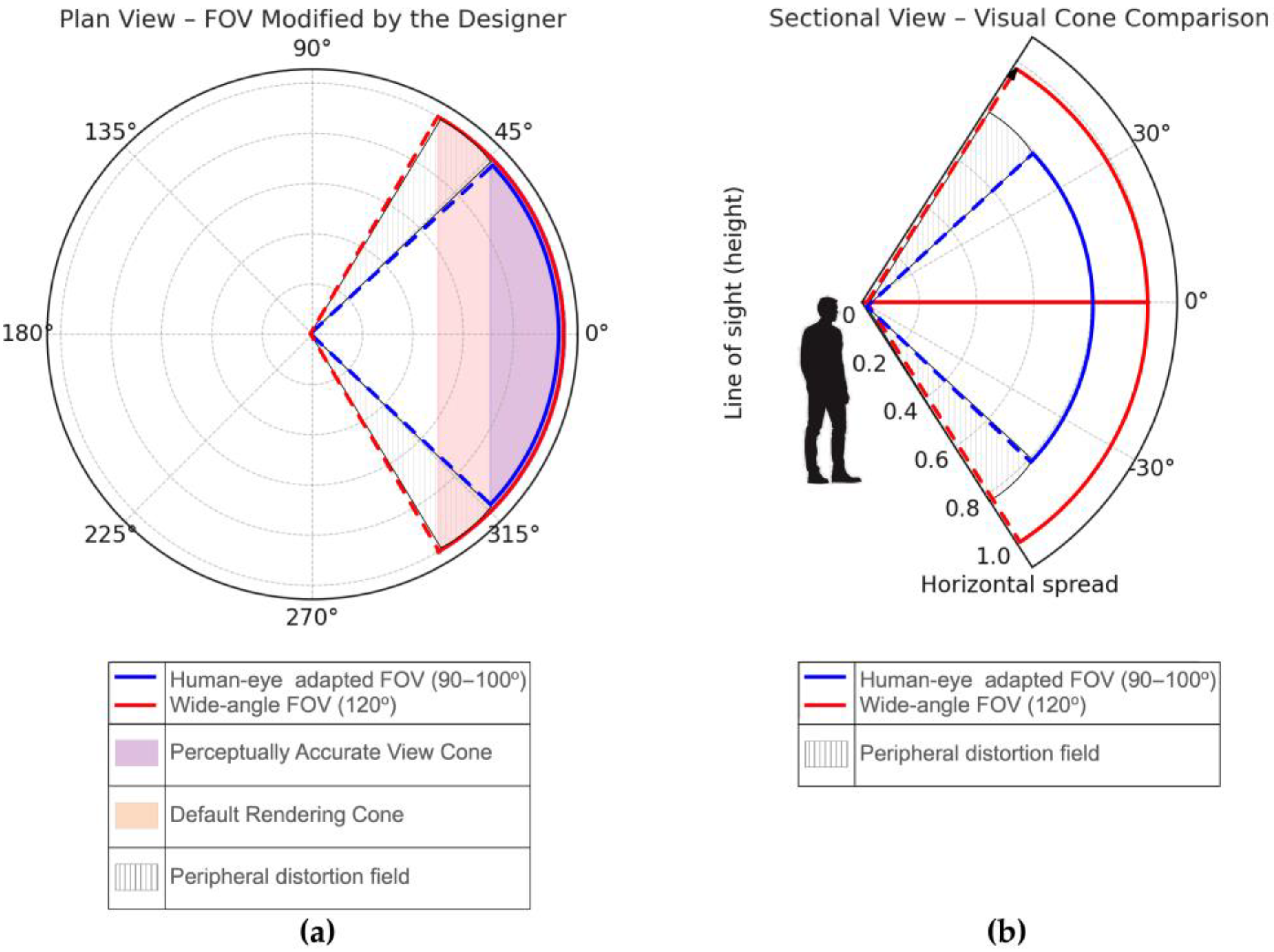 27] explored the cognitive consequences of restricted FOV conditions and found a marked decrease in users’ accuracy when estimating distances. This has important implications for VR-based architectural visualization, where default visualization settings often exaggerate perspective angles, potentially distorting spatial comprehension [