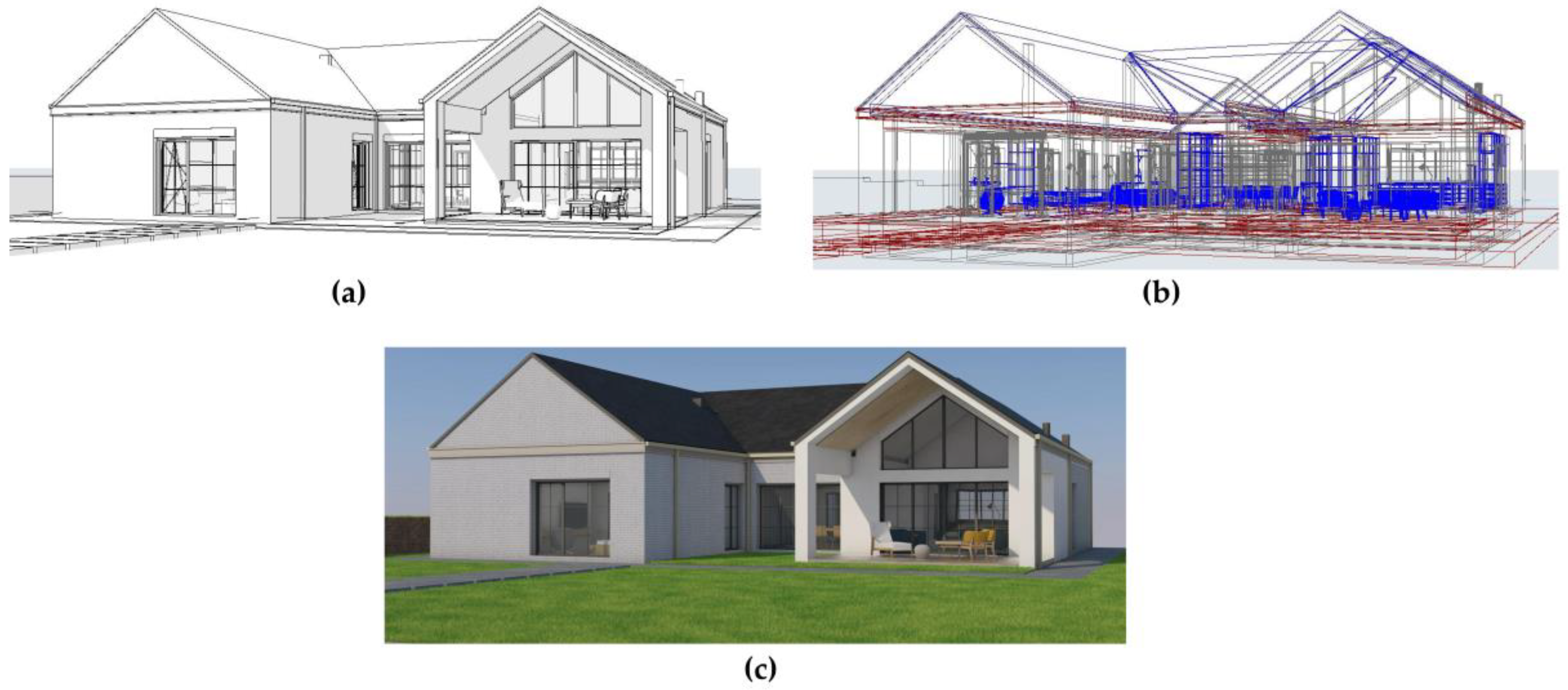 The digital building models were developed using BIM software and subsequently integrated into immersive VR environments. Each model included parametric metadata for architectural components such as walls, floors, roofs, windows, doors, and interior furnishings, capturing properties such as materials, thicknesses, and surface textures. Minor design modifications identified during immersive walkthroughs were implemented in real time during interactive design sessions, whereas major spatial or structural changes were introduced later following technical coordination.