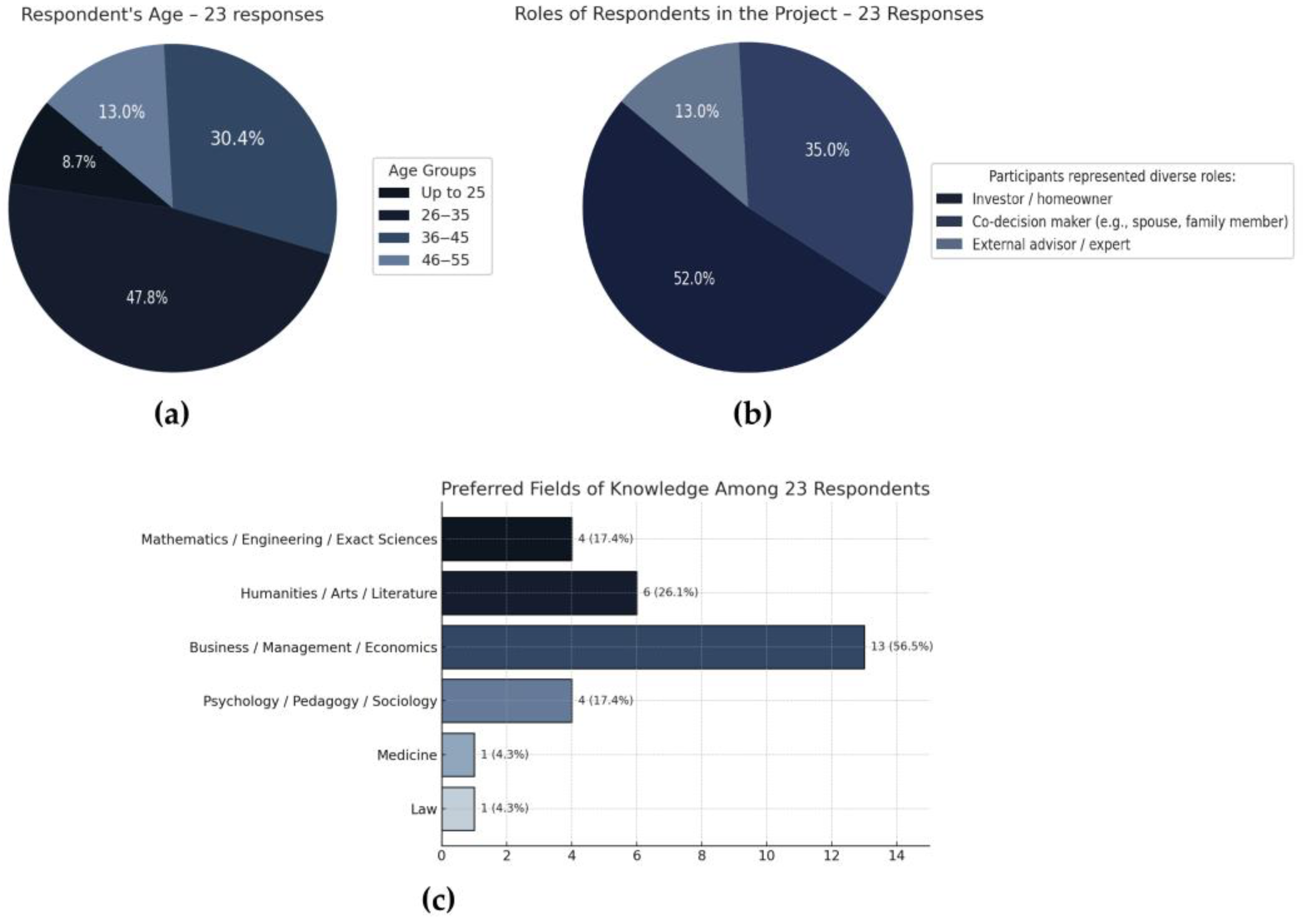 Twenty-three individuals (12 men and 11 women), including couples, participated in the study as stakeholders engaged in the architectural design of single-family homes. All participants were future residents of the proposed houses and represented a wide age range spanning three generations. This demographic diversity reflects the potential of contemporary technologies such as virtual reality to support inclusive engagement across different age groups and varying levels of digital proficiency.