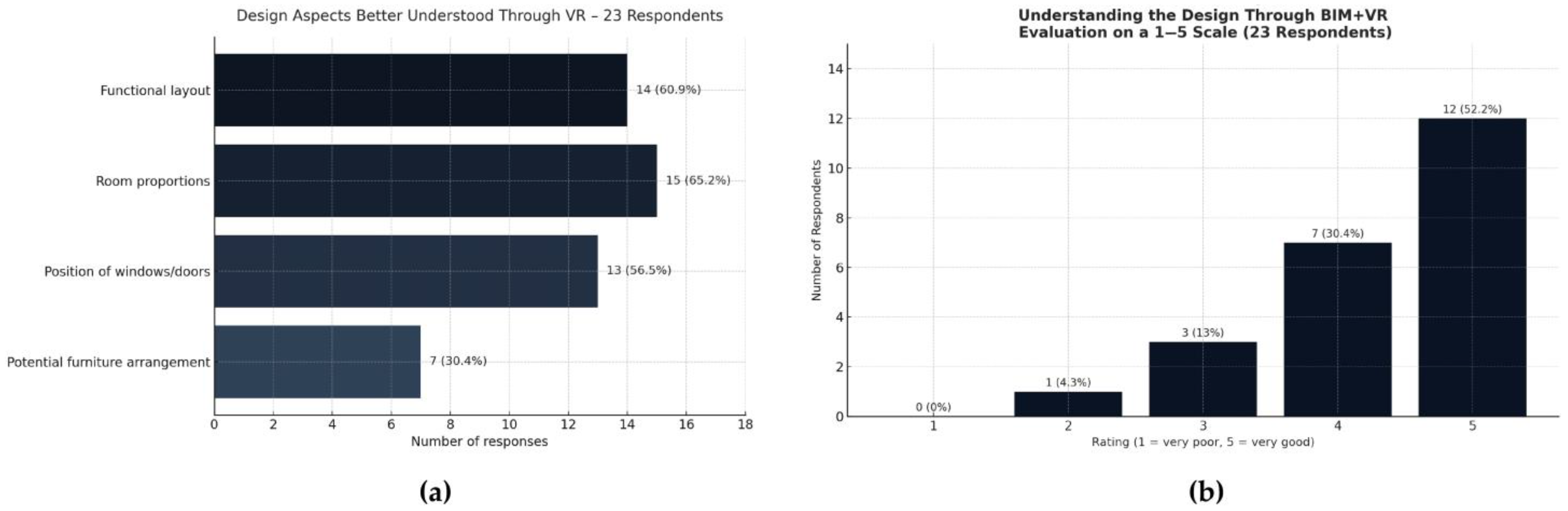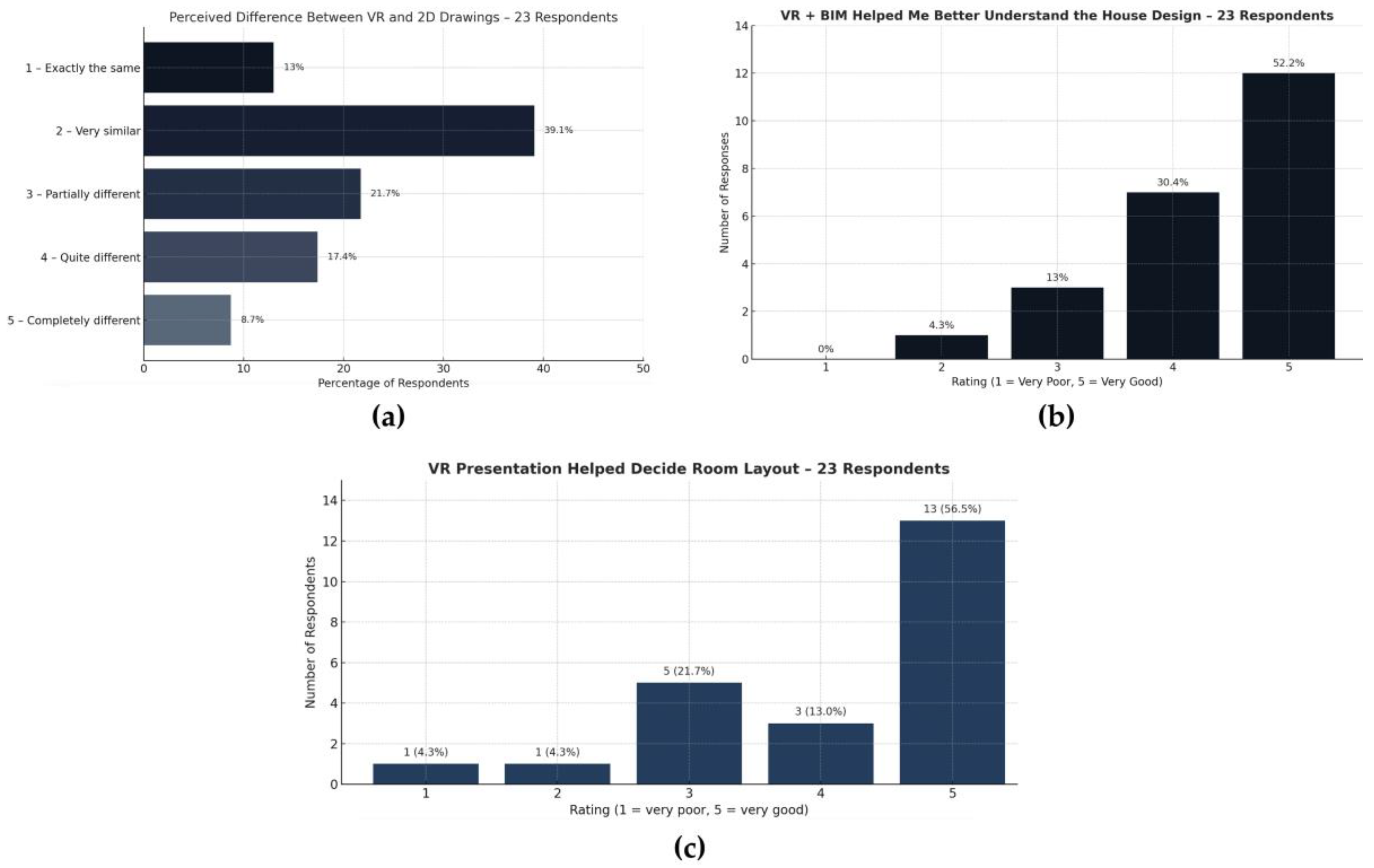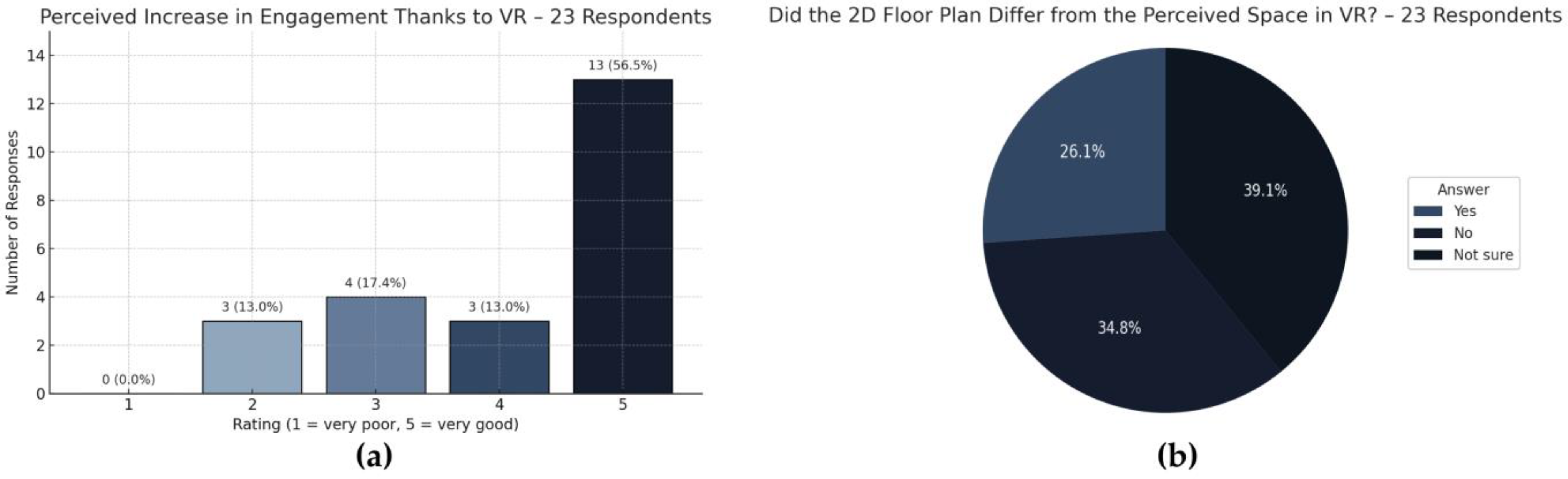 To evaluate user experience and the perceived value of BIM + VR walkthroughs in the residential design process, a structured questionnaire was administered to all 23 participants (