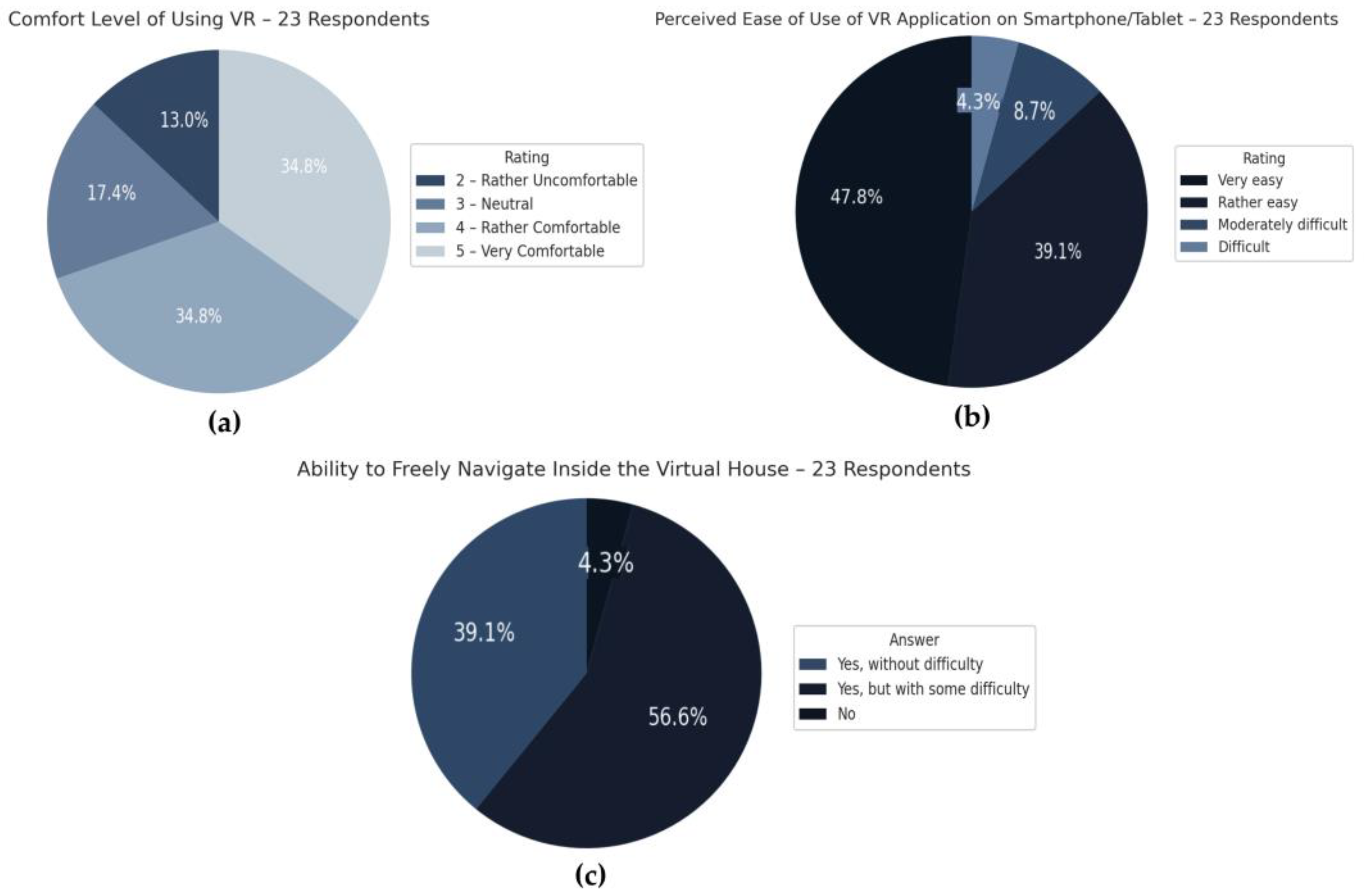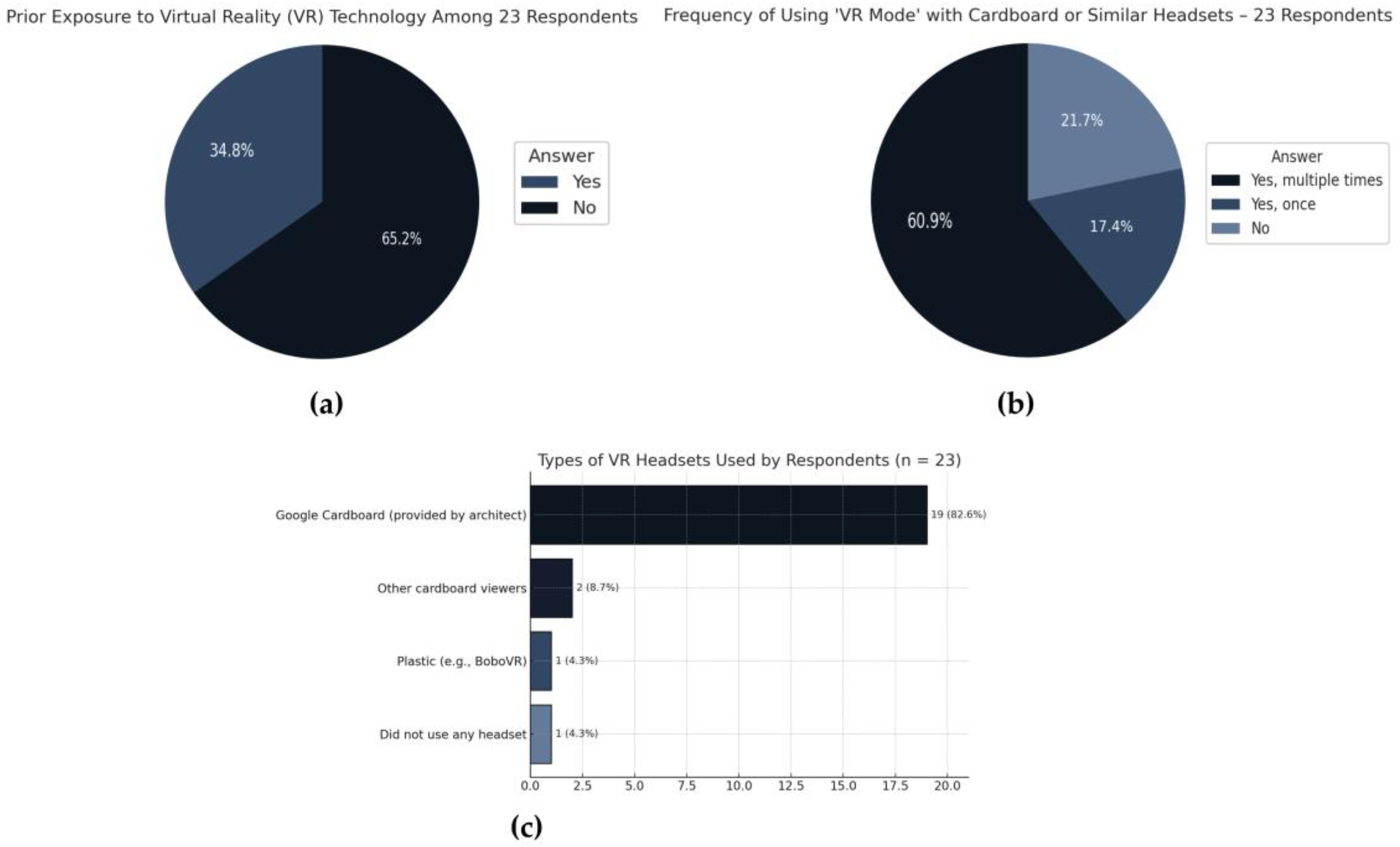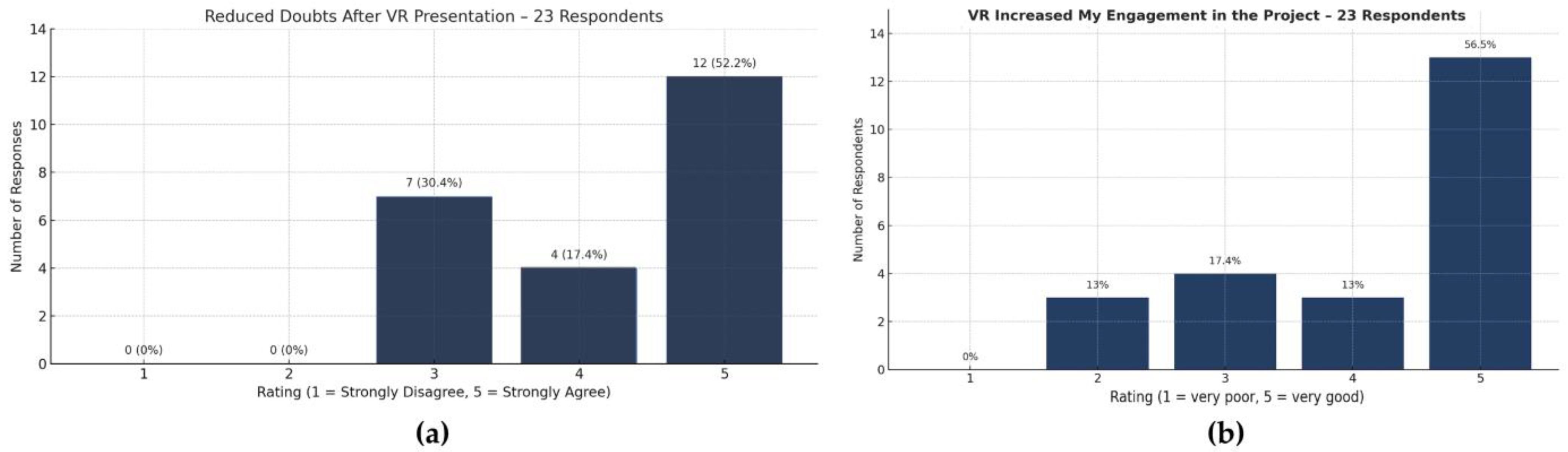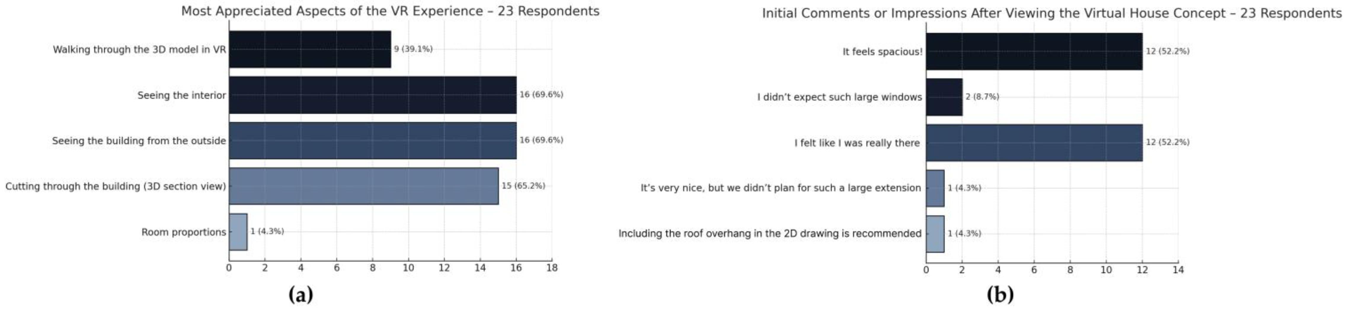 To evaluate user experience and the perceived value of BIM + VR walkthroughs in the residential design process, a structured questionnaire was administered to all 23 participants (