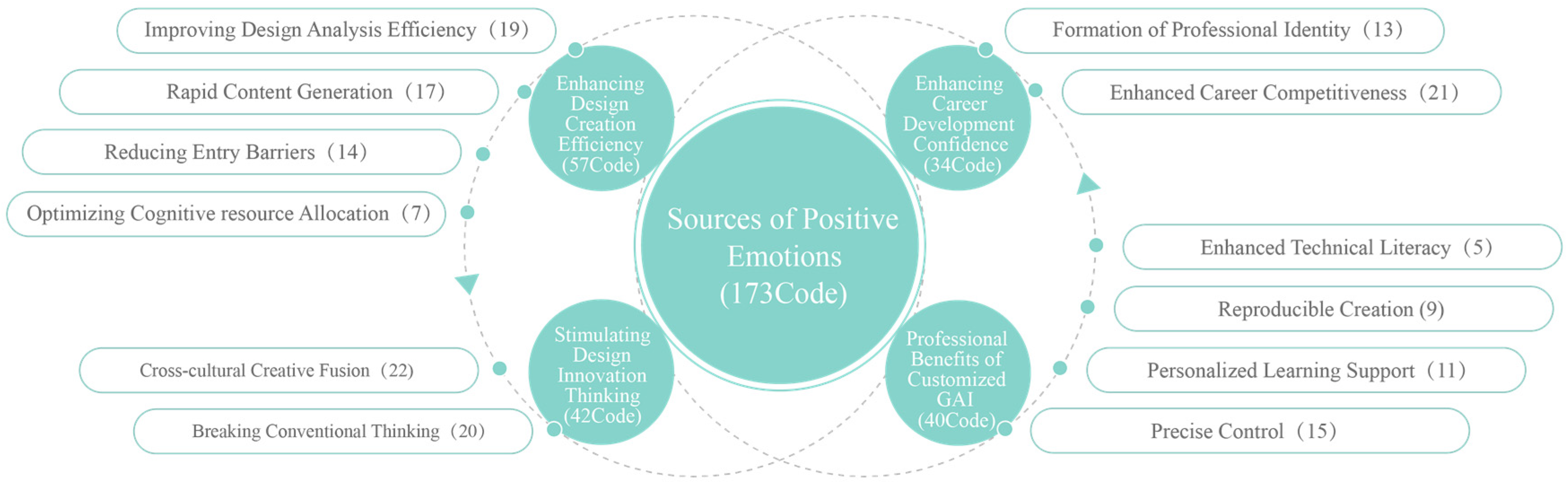 | Positive (235 codes) | Excitement | 38 | 16.2 |