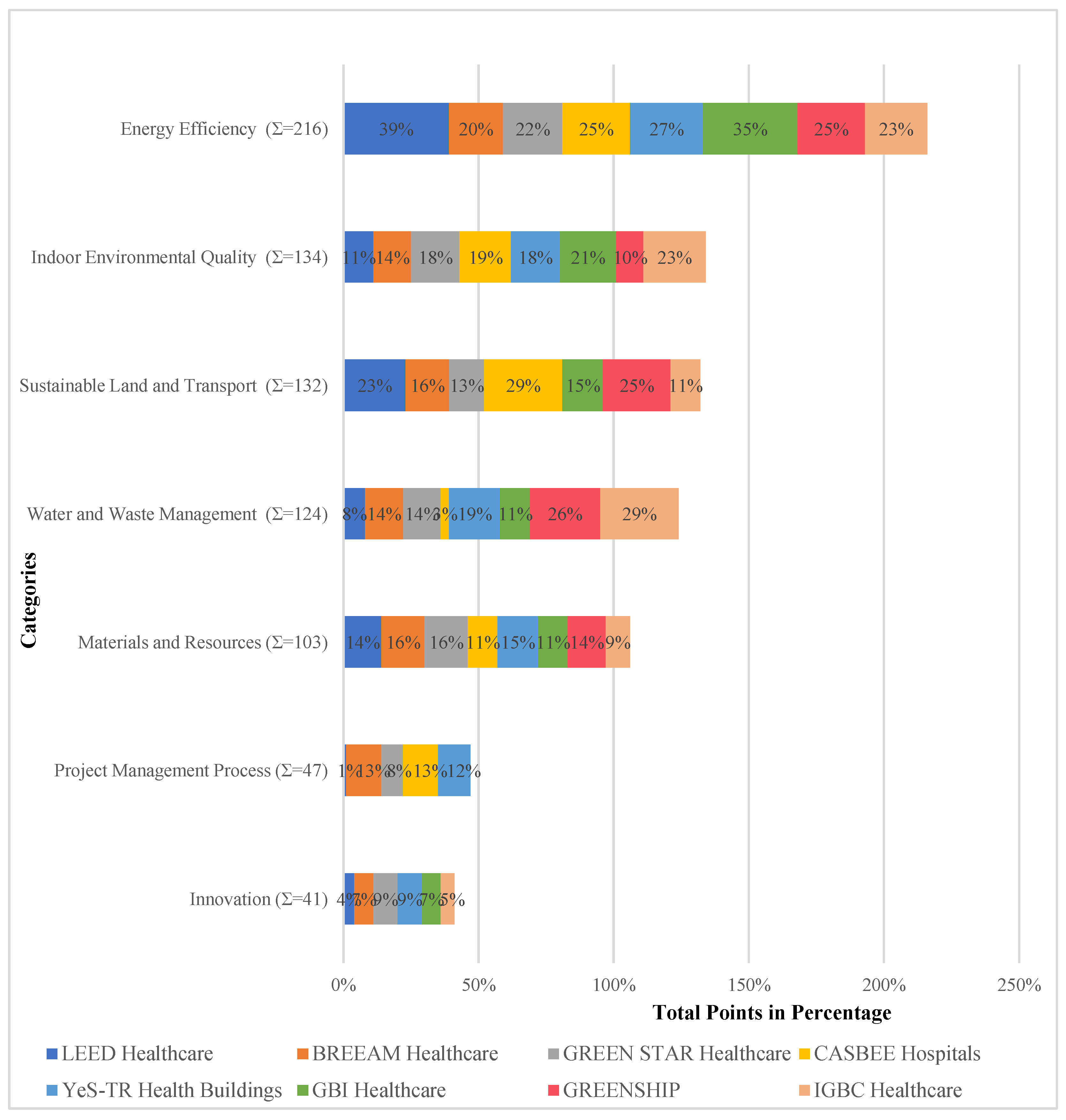 - The category with the highest joint weight is “Energy Efficiency” (Σ = 216), which is far ahead of the other categories. Systems such as LEED (39%) and GBI (35%) aim to reduce the high energy consumption of hospitals with sustainable methods by assigning a large weight to this area. In addition, systems such as YeS-TR (27%), GREENSHIP (25%) and CASBEE (25%) also prioritize energy management. This reveals that energy consumption is a critical factor in terms of sustainability in healthcare buildings [75,76].
