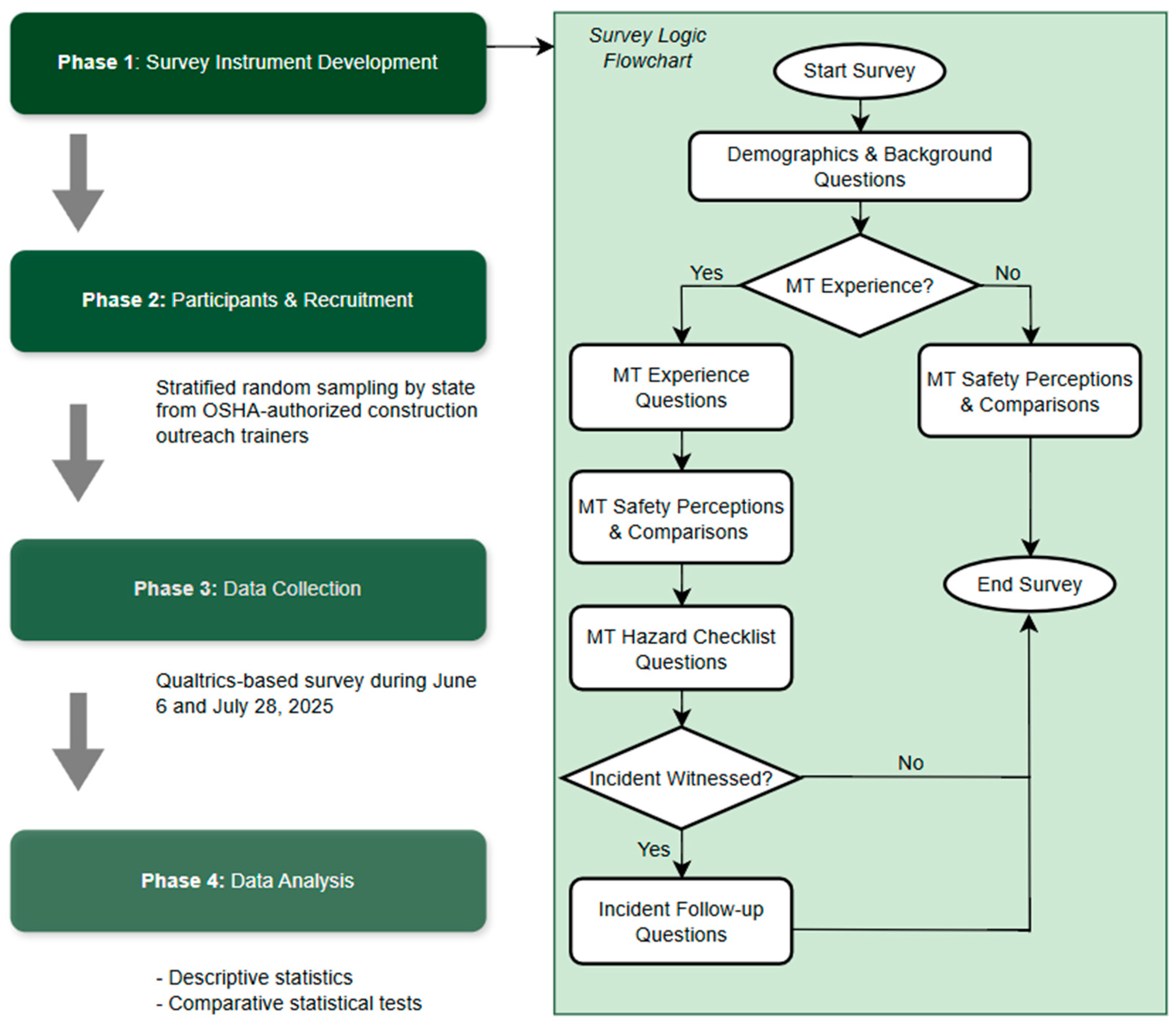 This study employed a cross-sectional, web-based survey to examine construction safety professionals’ perspectives on occupational safety in MT projects. The design enabled access to a geographically diverse population of practitioners actively engaged in safety oversight, supporting the goal of generating industry-relevant insights.