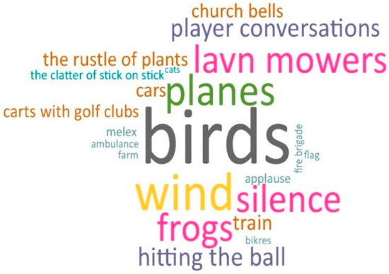 Respondents most often mentioned sounds associated with nature (e.g., birds, wind, frogs) when asked to name and list the sounds they heard on the golf course. Some players attempted to identify the birds they heard (e.g., ducks, corn crakes, cuckoos, and pheasants), highlighting the variety of bird sounds that were heard. The sounds of lawnmowers, airplanes, and trains are also important. The composition of sounds was completed by sounds associated with the game of golf, such as players’ conversations, the clatter of clubs against clubs, and applause (Figure 3). Perceived sound impressions were mostly positive (63% of all responses).