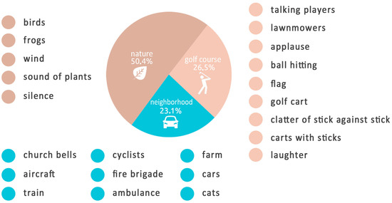The sounds mentioned by the players were grouped into three main categories: sounds of nature, of golf (golf course), and the golf course surroundings (neighborhood). Sounds belonging to the category of nature sounds represented over 50% of all sounds heard, followed by the second category (golf course), which represented over 26%, and the neighborhood category, which represented over 23% (Figure 4).