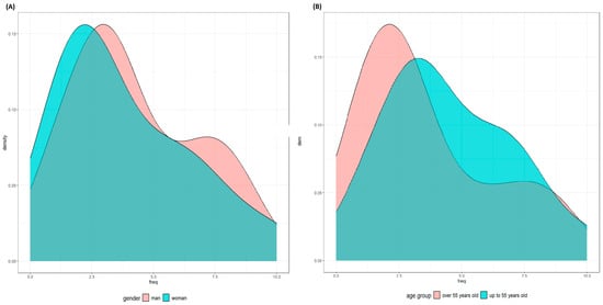 The distribution of the number of sounds heard by sex is shown in Figure 5A, and by age group in Figure 5B. The test for normality of the distribution did not yield a clear result, because the p-value was approximately 0.05. Density plots did not support the normality of the distribution; therefore, a robust version of the two-sample t-test for means was applied. On average, males heard 4.26 different sounds with CI = [3.21, 5.42], which is more than females with an average of 3.88 with CI = [2.71, 5.18], but this was not a statistically significant difference (p = 0.521). It was tested whether the total number of sounds heard by the two age groups of players (‘under 55’ and ‘over 55’) differed significantly. On average, the younger group heard 4.56 different sounds with CI = [3.50, 5.67], which is more than the older group, with an average of 3.61 with CI = [2.50, 4.83], but this difference was not statistically significant (p = 0.1837).
