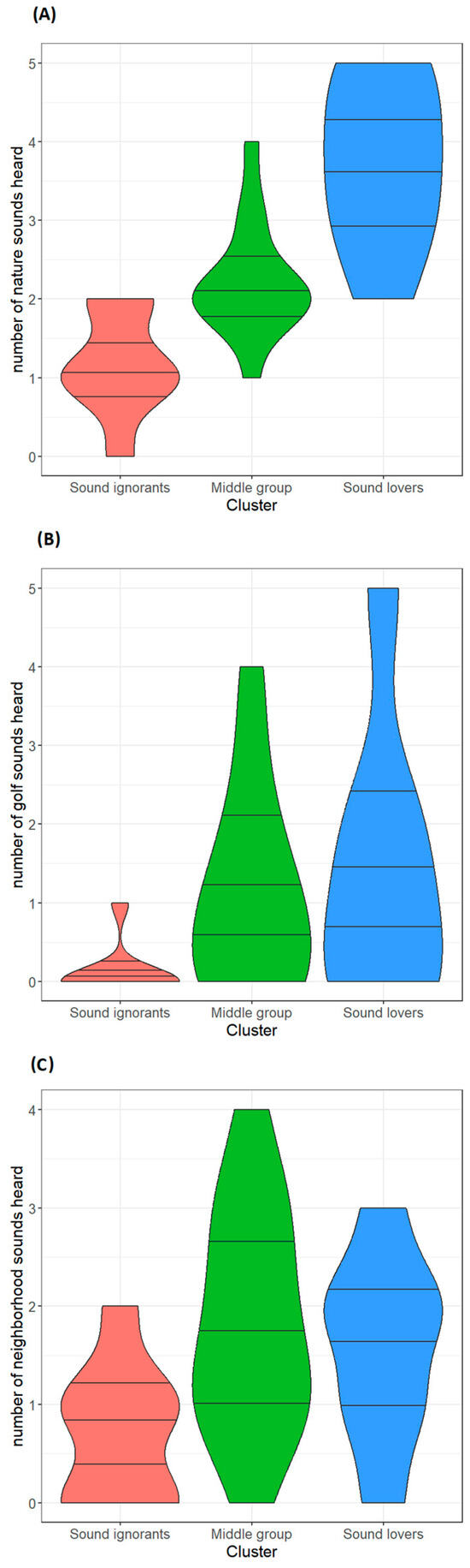 Violin plots showing the distribution of the number of sounds reported by individuals from the identified clusters: (A) nature sounds, (B) golf-related sounds, and (C) neighbourhood sounds..