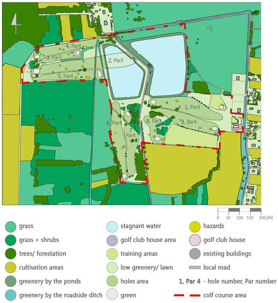 Within and adjacent to the golf course area, peaty soils are present, and the slope of the area is negligible. The golf course area is bordered to the north mainly by undeveloped land, including meadows, shrubs, cultivated land, and wooded areas adjacent to low-rise residential buildings. To the northwest, the golf course area is bordered by the Dąbry forest, which covers an area of over 1300 ha [22]. To the west, in the immediate vicinity of the golf course, there are no built-up areas, but mainly grass and bushes, with a smaller proportion of tall green and cultivated land. To the south, there are cultivated areas, meadows, bushes, and tall trees in the immediate vicinity of the golf course. To the east, the study area is bordered by meadows, shrubs, and low buildings along a local road. It extends along the eastern and northern sides of the golf course and runs through the center of the golf course between the fishponds (Figure 8).