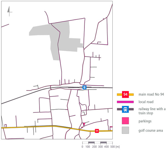 Two analyses were conducted for this spatial extent: transportation and land cover functions. First, we can see the distribution of local roads, railway lines with stops, main road No. 94, and public car parks. The railway line and main road run in an east–west direction. The distance of the golf clubhouse from the railway line in a straight line was approximately 800 m, and that of the main road No. 94 was approximately 1600 m. It can be seen that the local road network is mainly developed on both sides of the main road and around the railway stop in Trzciana. In the vicinity of the golf course, there are only two roads that mainly serve local residents in the immediate area and do not generate much noise (Figure 9).