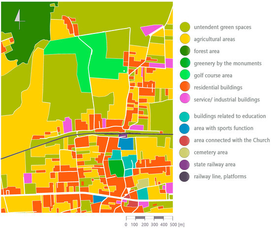 The analysis of land cover functions shows the extent to which the land is developed for different functions. Along roads, there is mainly low-rise residential development, sometimes with a service or industrial function. It was more dispersed to the north of the railway line and denser to the south. There are also other functions and more diverse buildings between the railway line and the main road No. 94. Land is also associated with educational, sports, and religious functions. In contrast, the proportion of biologically active areas was much higher than that of built areas (Figure 10).