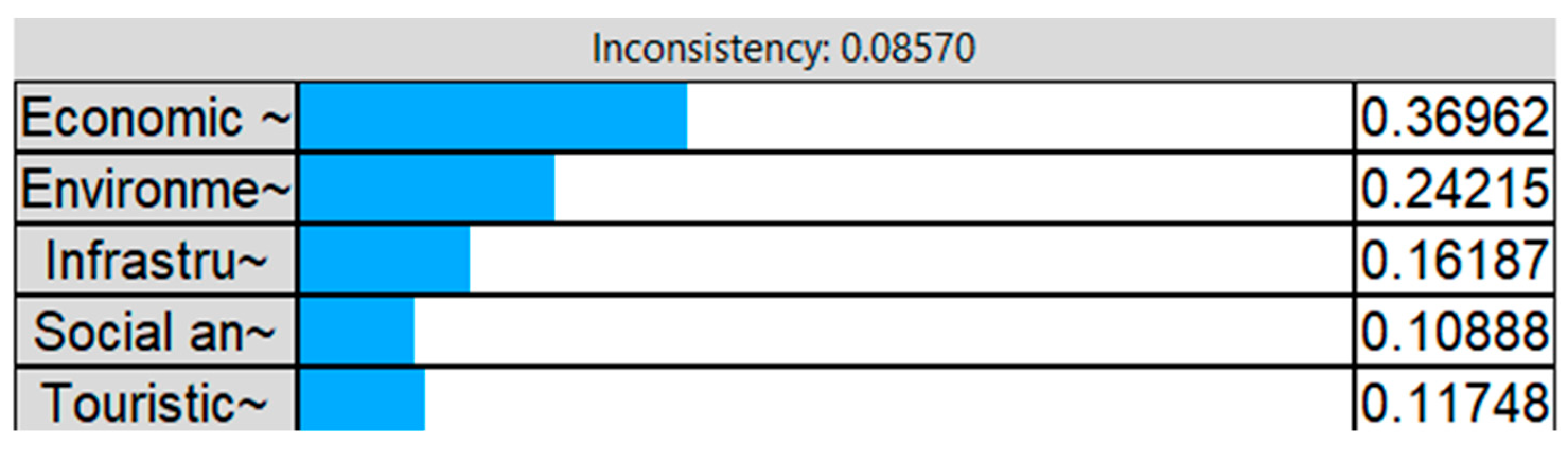 | Infrastructure and management | 0.1618 (16.18%) | A moderately important criterion encompassing accessibility, accommodation quality, road connectivity, and investments in infrastructure. |