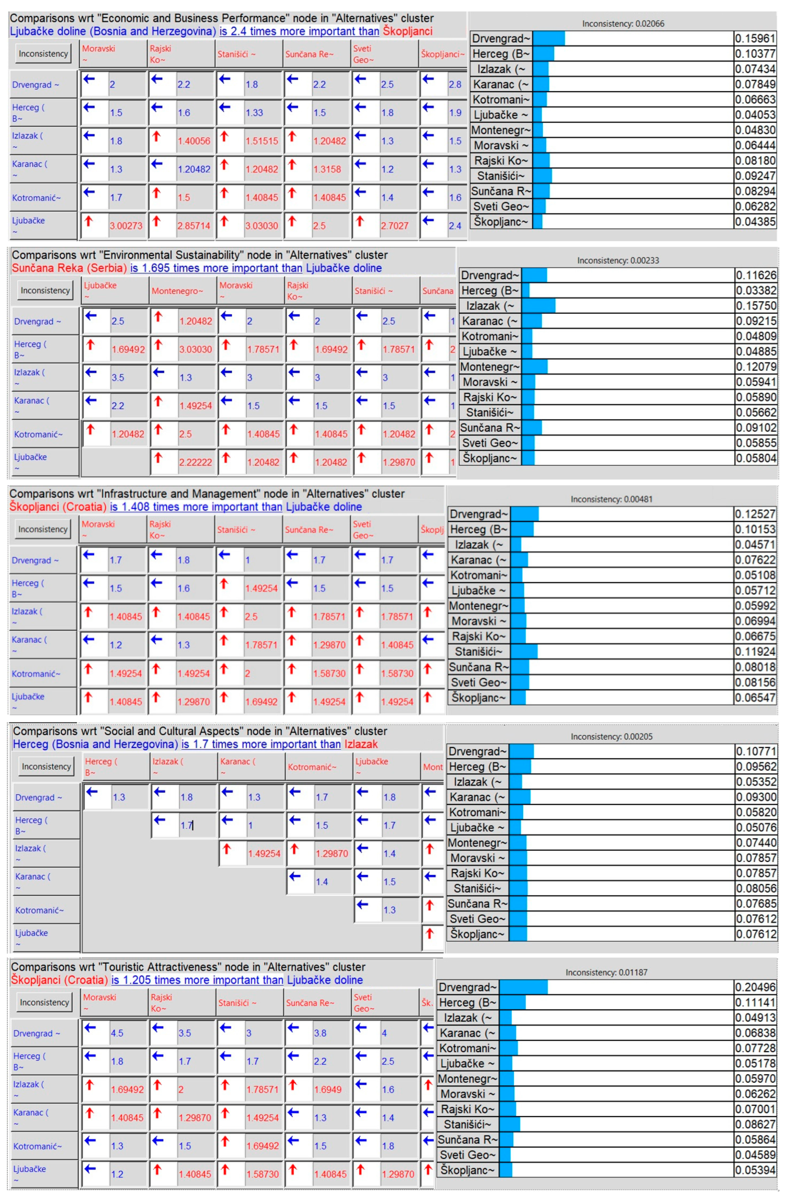 | Touristic attractiveness | 0.1175 (11.75%) | Less influential than economic or environmental sustainability but still crucial for visitor engagement and experience. This includes cultural attractions, unique experiences, and visitor programs. |