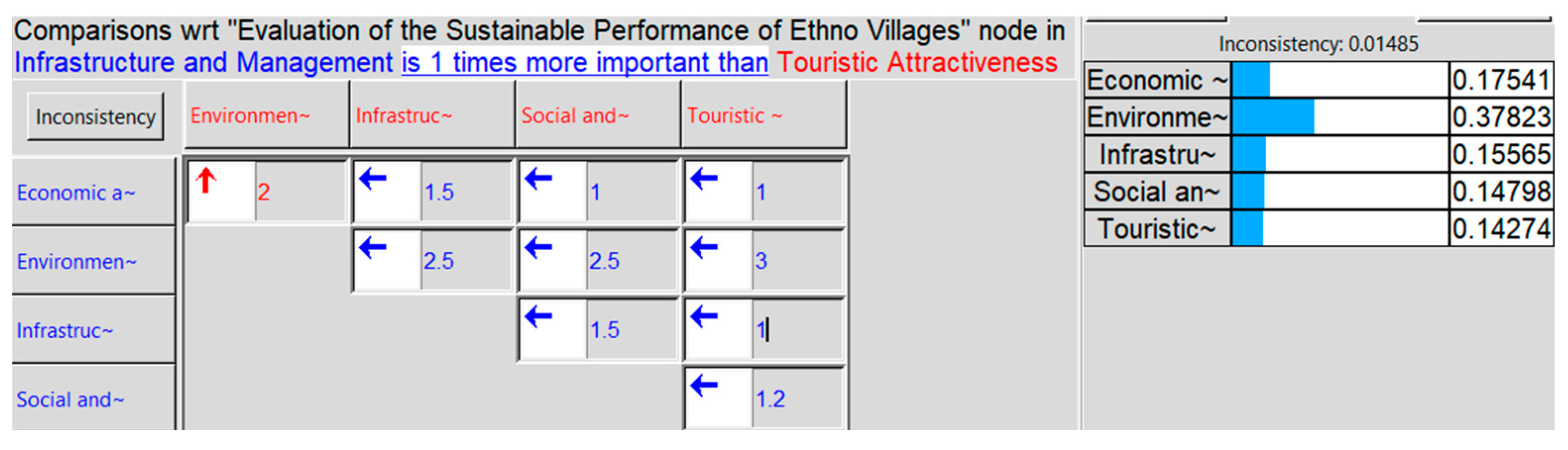 | Environmental sustainability | 0.2421 (24.21%) | The second most important criterion, reflecting the environmental impact of the ethno-village, the adoption of sustainable practices, and the preservation of natural resources. |