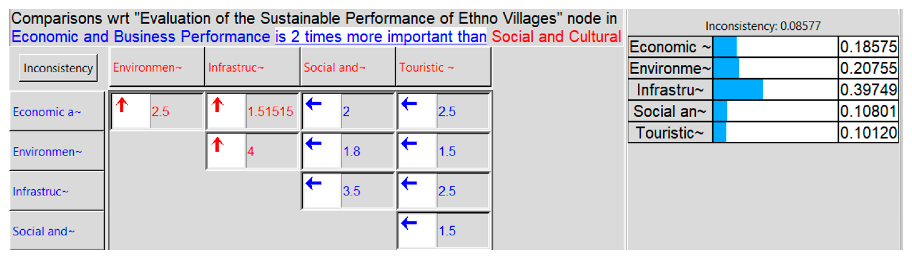 | Economic and business performance | 0.3696 (36.96%) | The most important criterion—economic performance—has the greatest impact on the sustainability of an ethno-village. This includes income generation, profitability, employment opportunities, and overall financial stability. |