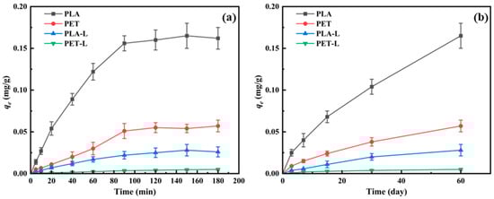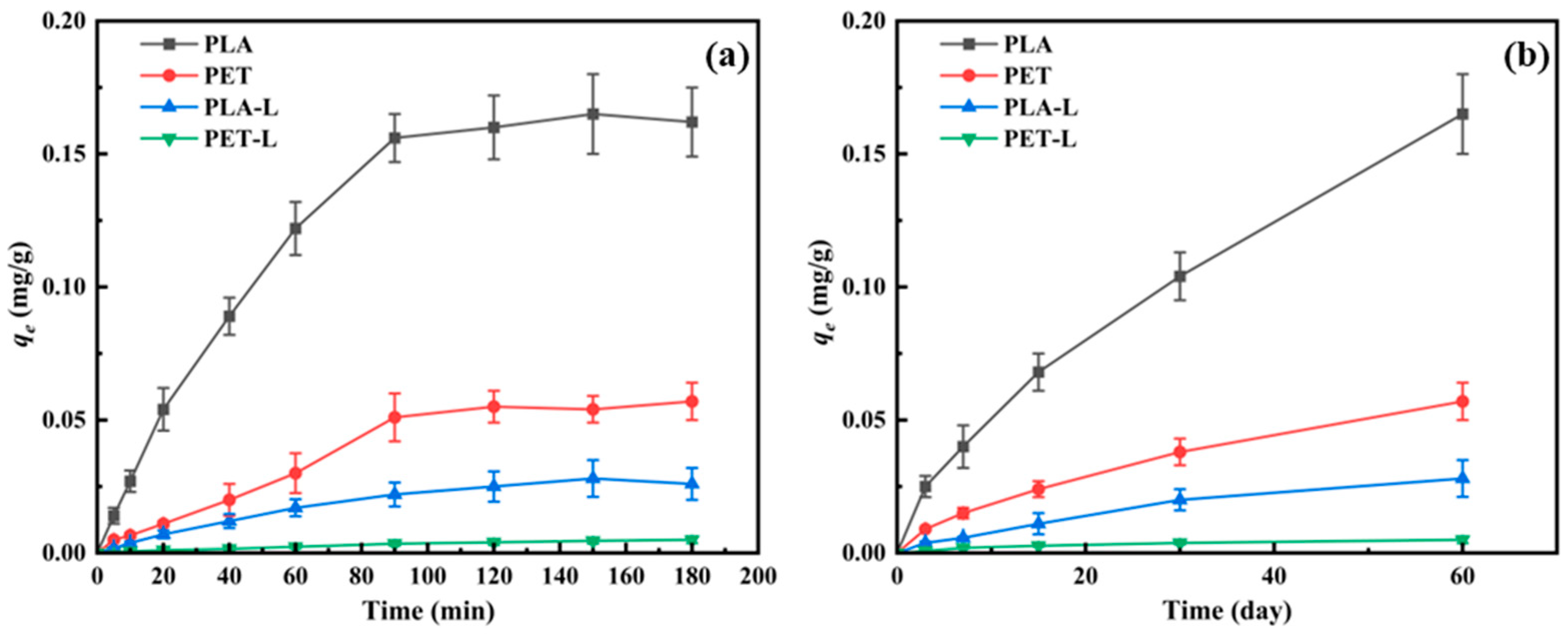 Adsorption of SMX onto aged microplastics. (a) Adsorption kinetics of SMX onto microplastic fragments and their corresponding suspensions (L) after 60 days of UV aging. (b) Equilibrium adsorption capacity of SMX onto microplastic fragments and suspensions (L) at different UV aging time points. Note: PLA and PET denote aged microplastic fragments; PLA-L and PET-L denote the suspensions containing micro/nanoplastics released during the aging process.