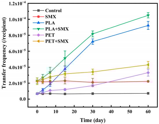 Furthermore, as shown in Figure 4, aged PLA consistently induced a higher ARGs transfer frequency than aged PET. After 60 days, the frequency in the PLA-alone group reached 9.23 × 10−5, representing a 12.7-fold increase over the control. Moreover, co-exposure with SMX provided a notable enhancement in transfer frequency compared to treatments with microplastics alone. Among these, the combination of PLA and SMX exhibited the strongest promoting effect, reaching approximately 14.5 times that of the control.