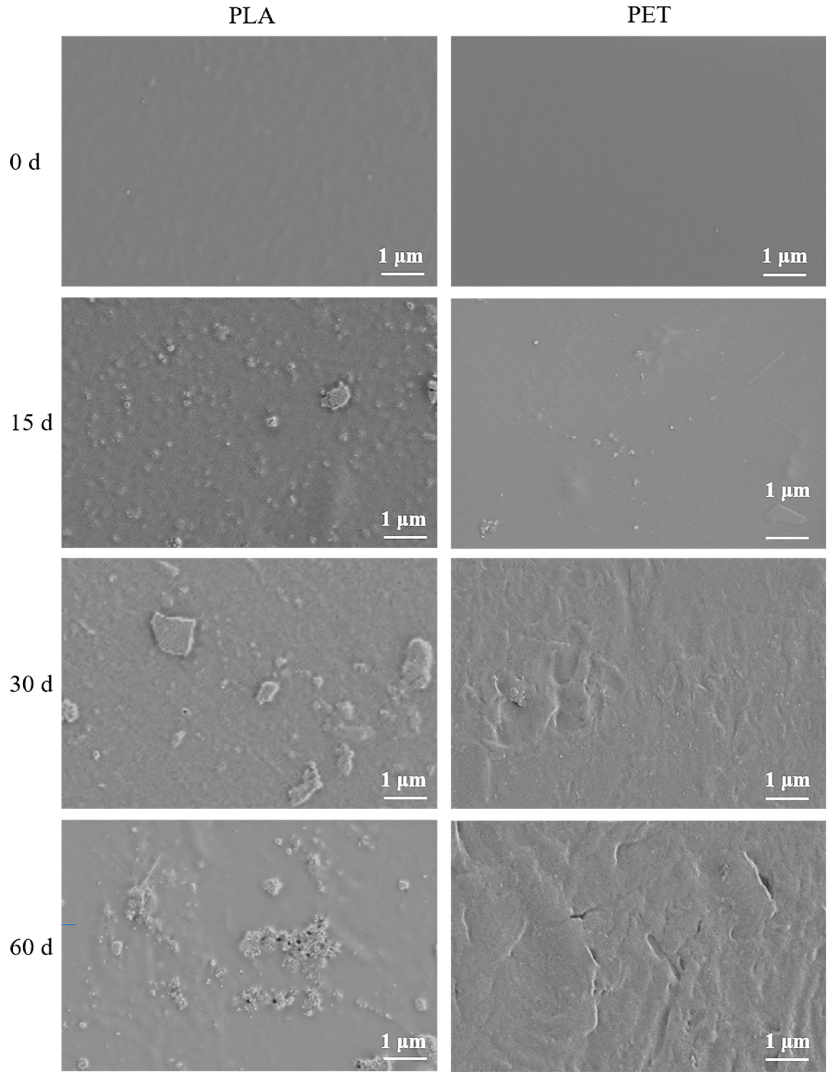 SEM images of the surface morphology of two types of microplastics, PLA and PET, after different aging periods.
