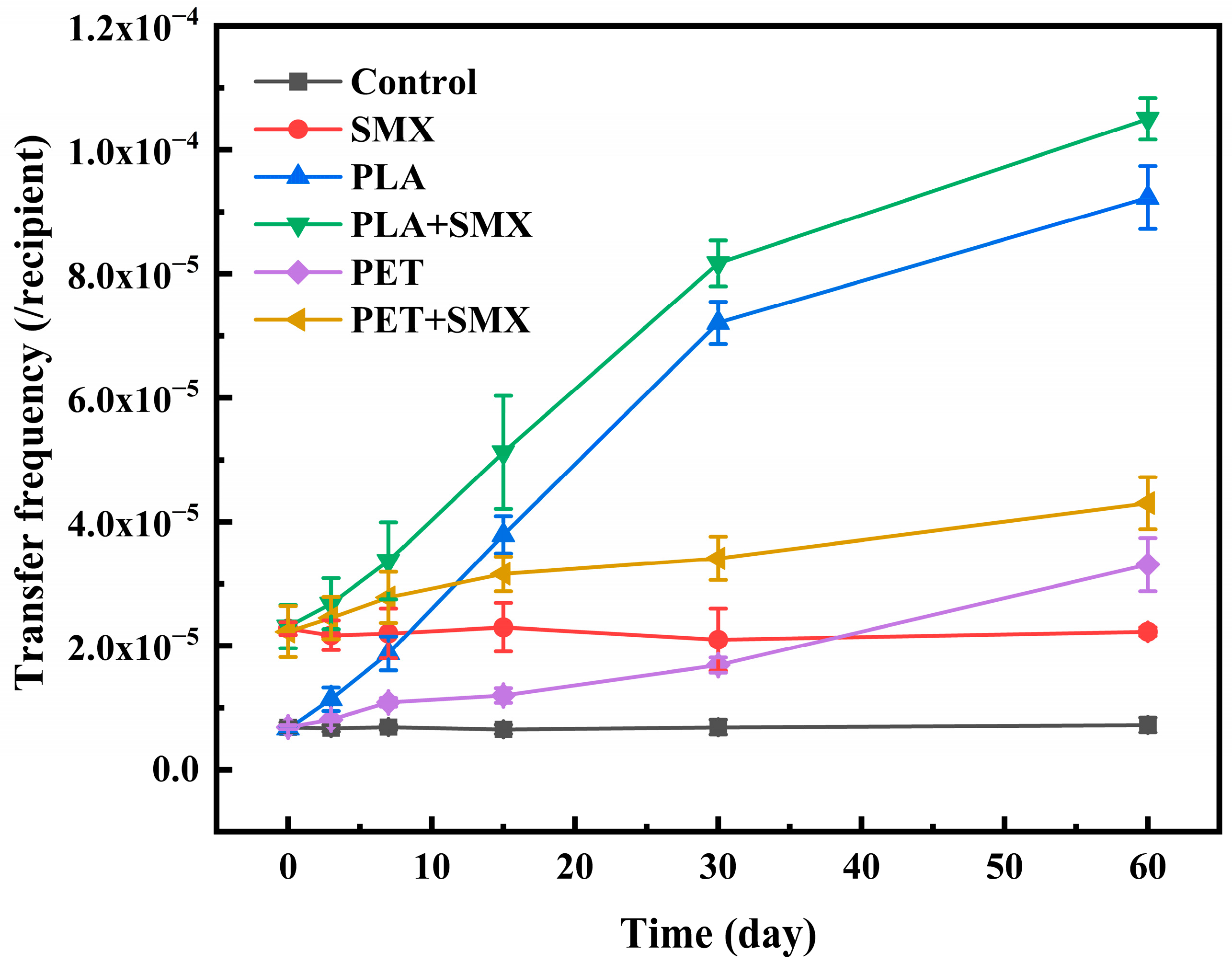 Effects of PLA and PET alone or mixed with SMX on the conjugative transfer of ARGs in bacteria after different aging times.