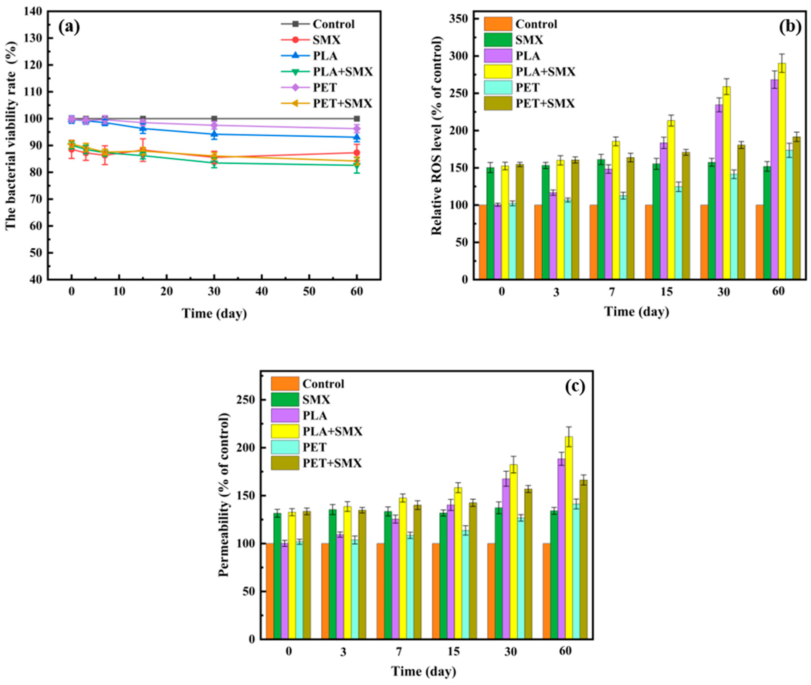 Effects of PLA and PET alone or mixed with SMX on bacterial viability (a), ROS levels (b), and bacterial membrane permeability (c).