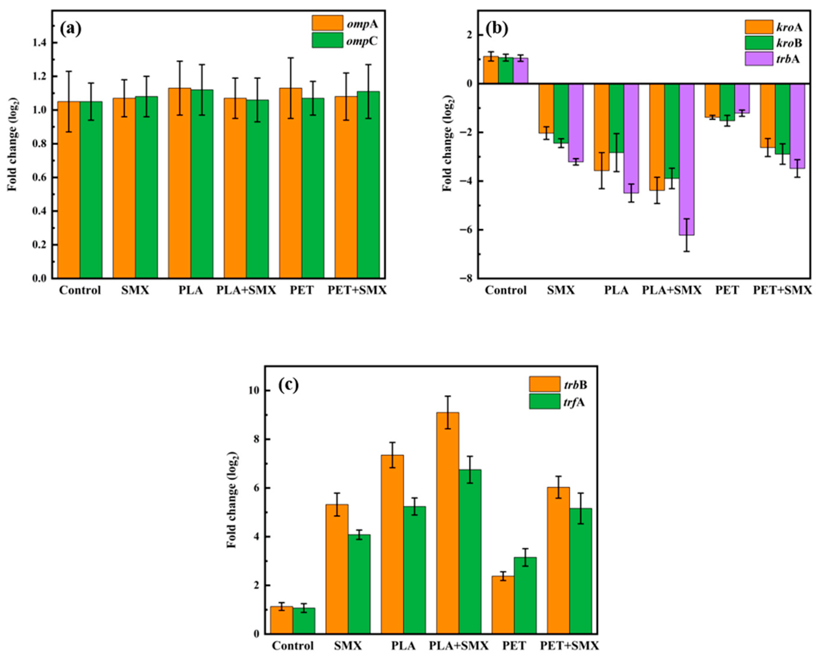 Effects of PLA and PET alone or mixed with SMX on the expression of conjugative transfer related genes. (a) Effects on the expression of two outer membrane porin genes (ompA and ompC). (b) Effects on the expression of three major global regulatory genes (korA, korB and trbA). (c) Effects on the expression of mating-pair formation (Mpf) genes trbB and the DNA transfer and replication (Dtr) system genes trfA.