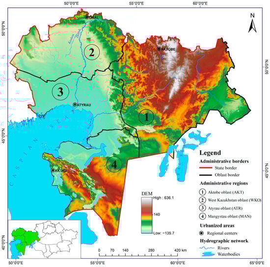 The Western Kazakhstan region (WKR) spans an area of approximately 736,000 km2, accounting for around 27% of the total land area of the Republic of Kazakhstan. Geographically, it extends between 41°21′08″ and 51°43′15″ N latitude, and 46°29′22″ to 64°08′57″ E longitude. Administratively, the region comprises the Aktobe (AKT), West Kazakhstan (WKO), Atyrau (ATR), and Mangystau (MAN) oblasts (Figure 1) [,].