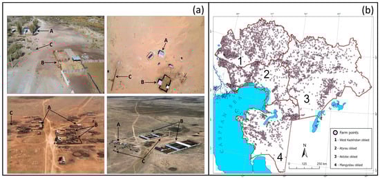 (a) Aerial photographs of representative farms within the study region: (A) a dwelling for the farmer and their family, (B) sheepfolds and enclosures for livestock, (C) water supply sources, (b) Spatial distribution of farm locations across the study area.