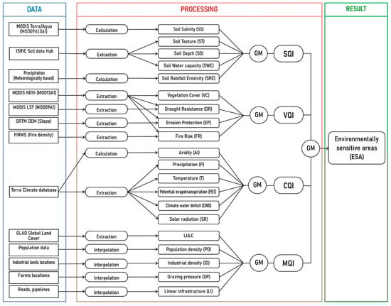 In line with the MEDALUS methodological framework [,,,,], a total of 20 indicators derived from remote sensing data were employed to assess Environmentally Sensitive Areas (ESA). These indicators were organized into four composite indices: the Vegetation Quality Index (VQI), Soil Quality Index (SQI), Climate Quality Index (CQI), and Management Quality Index (MQI) (Figure 4).
