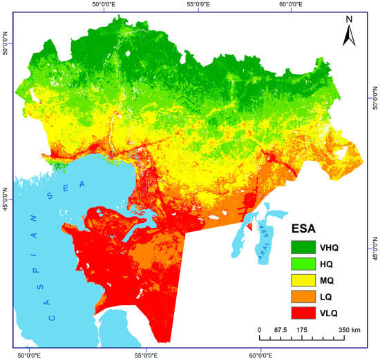 The final output of the MEDALUS model integrates all previously calculated indices that reflect the condition of soil, vegetation, climatic factors, and the effectiveness of land degradation and desertification management in the study region. The ESA was calculated as the geometric mean of the four composite indices—SQI, VQI, CQI, and MQI—in accordance with Equation (5).
