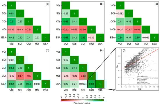 Maps of the spatial distribution of different SQI indicator sensitivity scores ((a): SS; (b): ST; (c): SD; (d): SWC; (e): SRE).