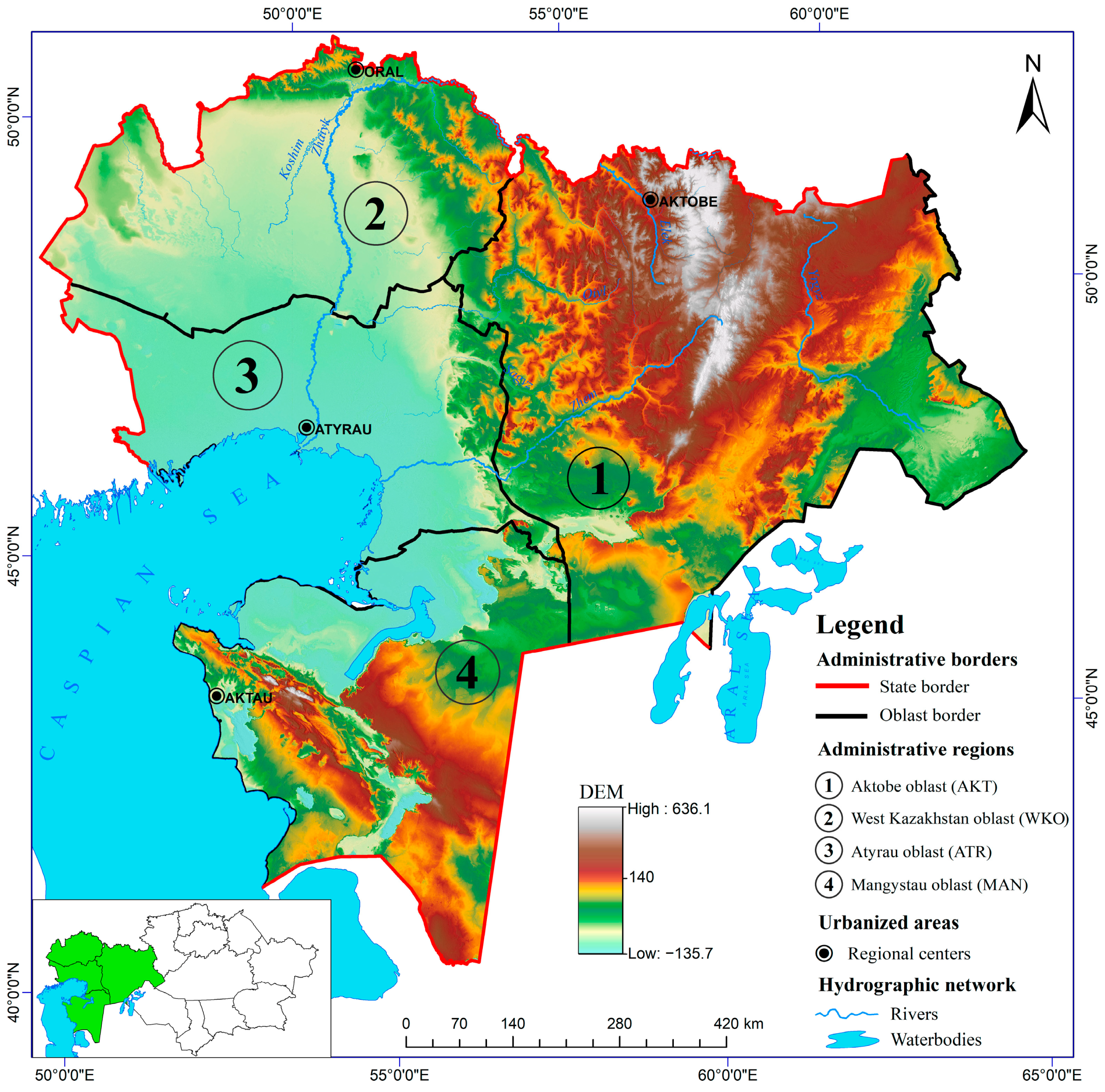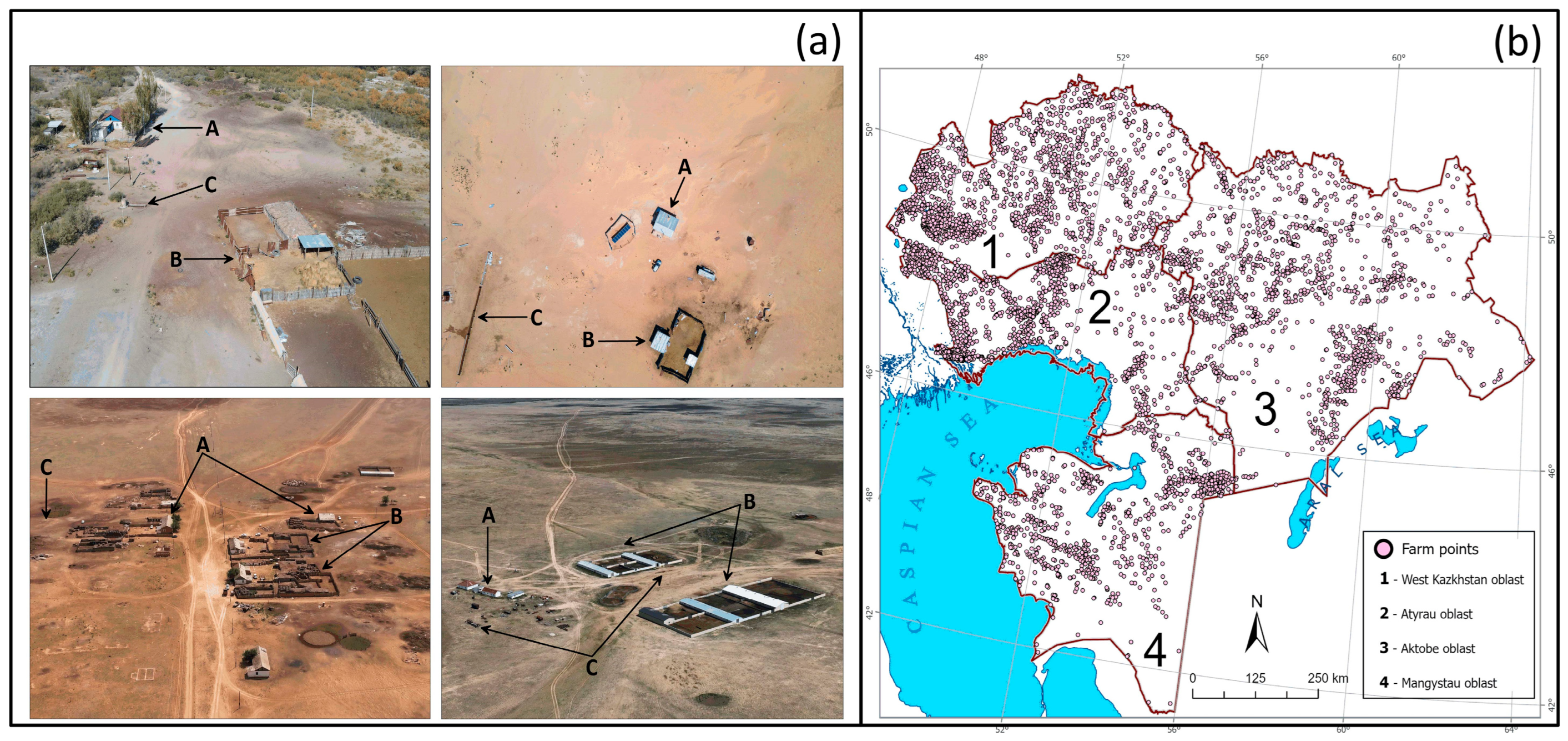 - Tokbergenova, A.; Skorintseva, I.; Ryskeldiyeva, A.; Kaliyeva, D.; Salmurzauly, R.; Mussagaliyeva, A. Assessment of Anthropogenic Disturbances of Landscapes: West Kazakhstan Region. Sustainability 2025, 17, 573. [Google Scholar] [CrossRef]