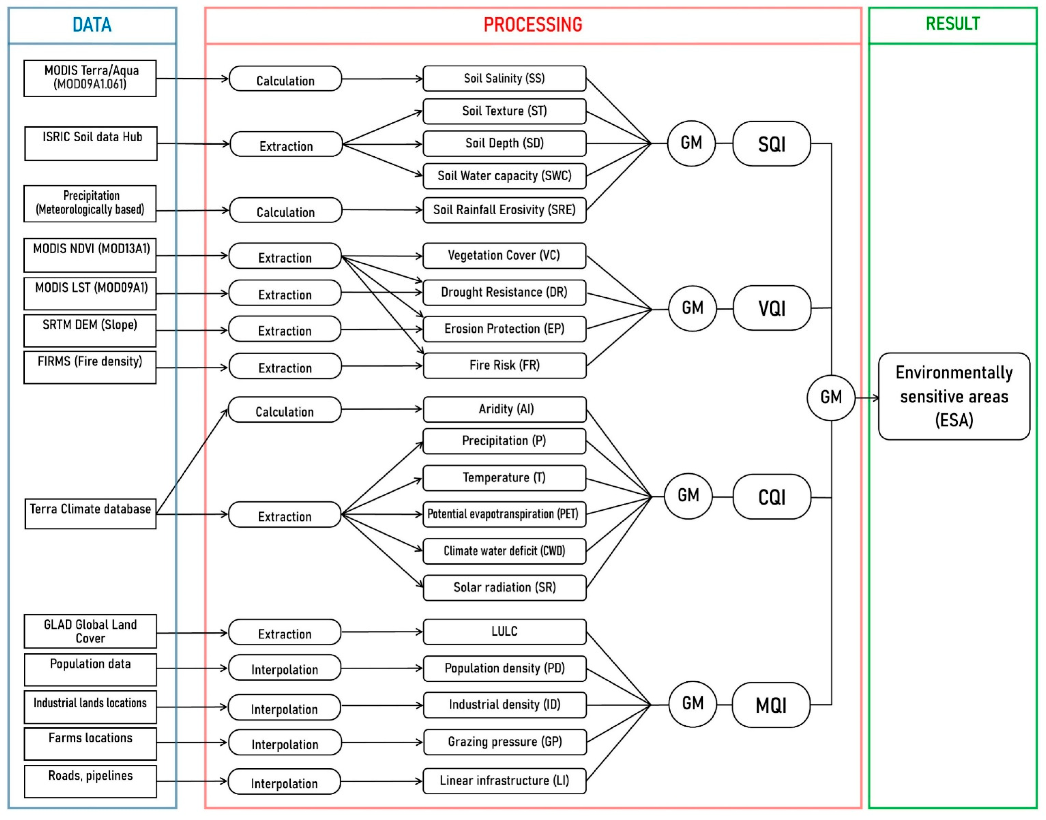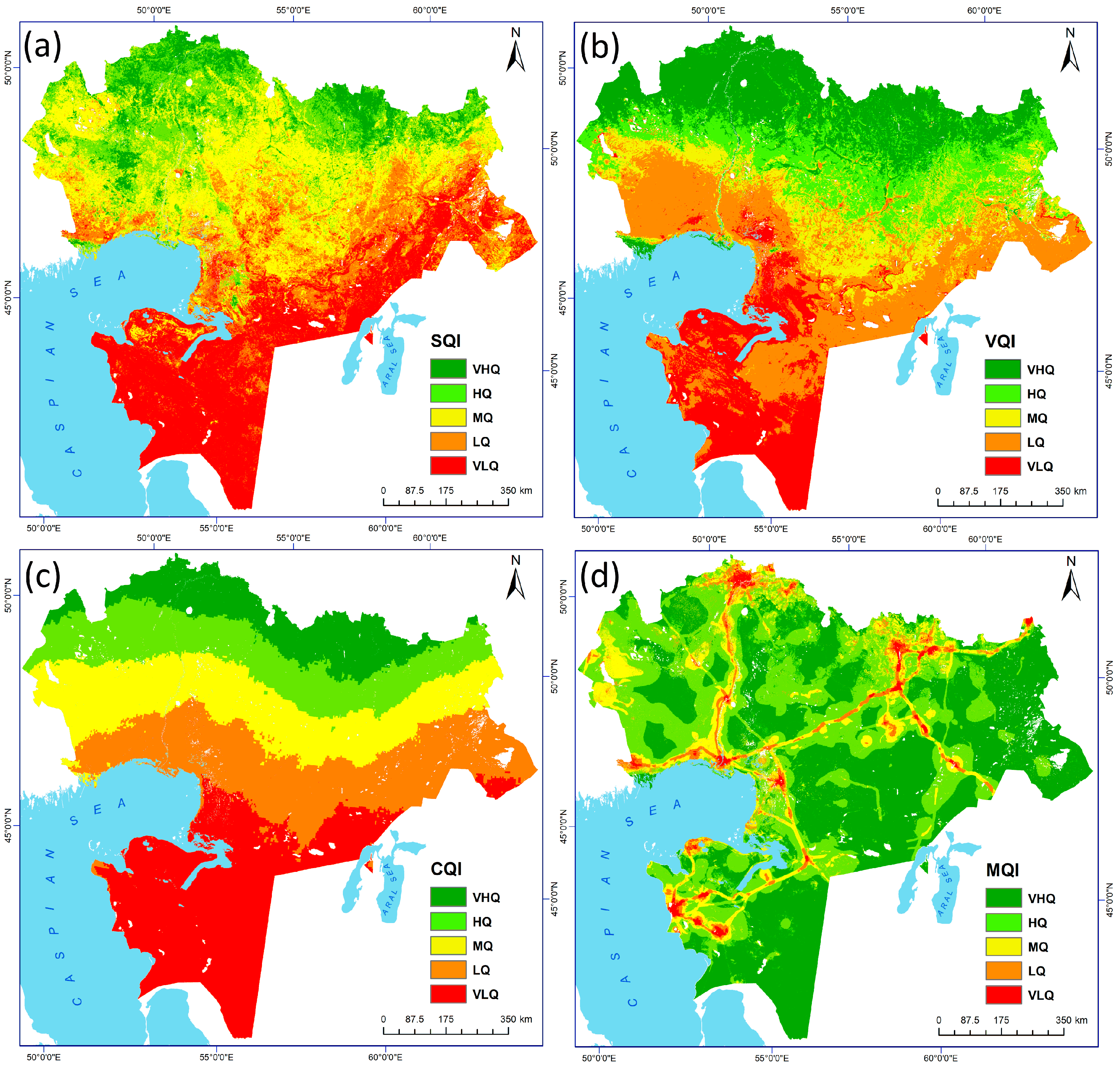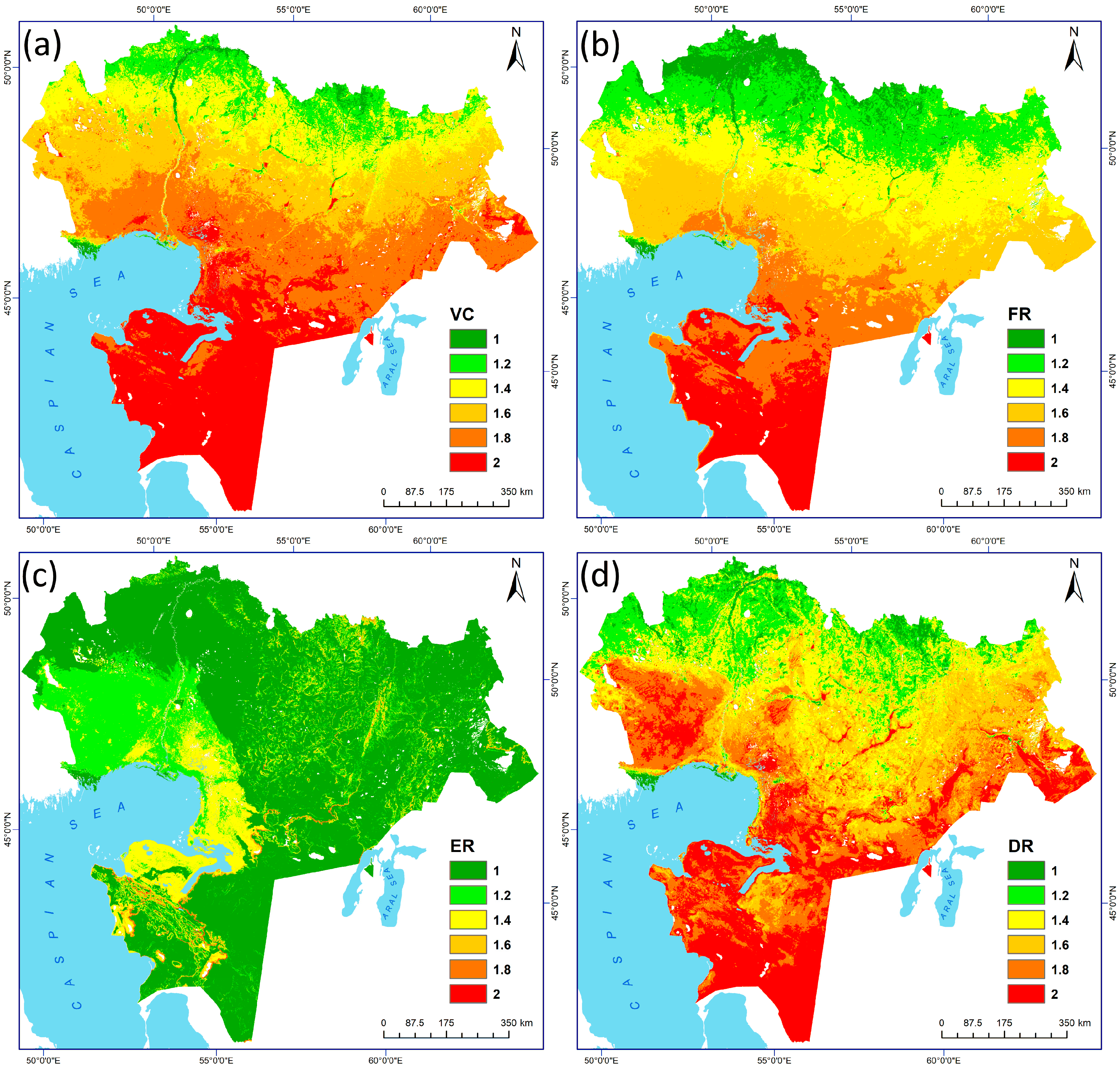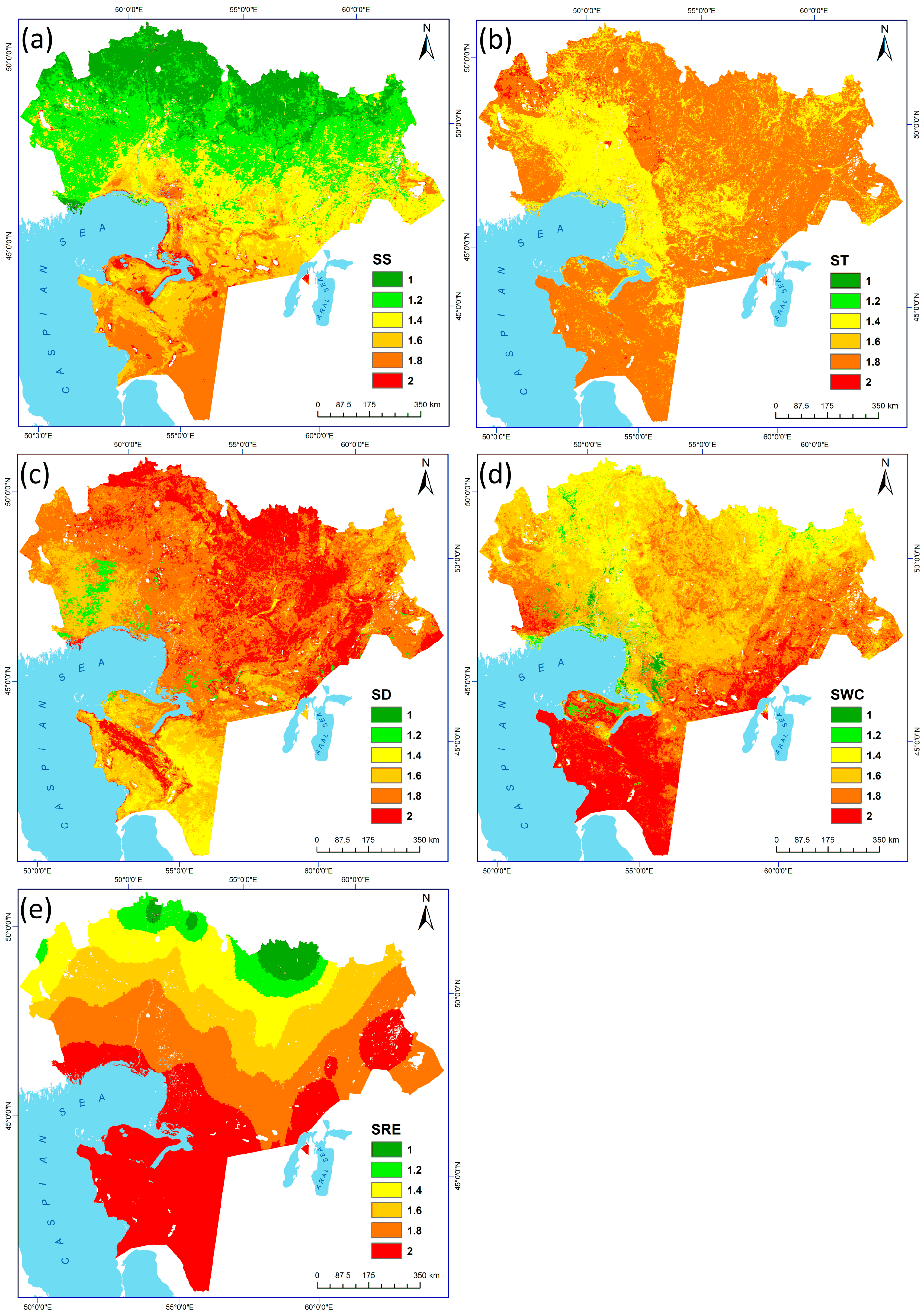 - Highly variable: vegetation (NDVI, VQI, VHI for drought resilience), soil salinity (NDSI MODIS), fire risk (NDVI, LST, fire frequency), erosion resistance (slope-NDVI ratio), together with land use and land cover (LULC) and management indicators (population density, industrial activity, linear infrastructure, and grazing pressure).