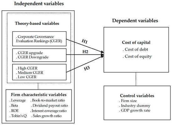 We also used firm size (SIZE), an industry dummy (IND), and the GDP growth rate (GDPG) [4] to control for the different firms, industries, and macroeconomic conditions prevailing at the time of the CGER announcement. ε is the error term. Table A2 in Appendix A lists the definitions of the theory-based, firm characteristics, and control variables. Figure 1 presents the research framework and hypotheses, which are based on hypotheses development and methodology description.